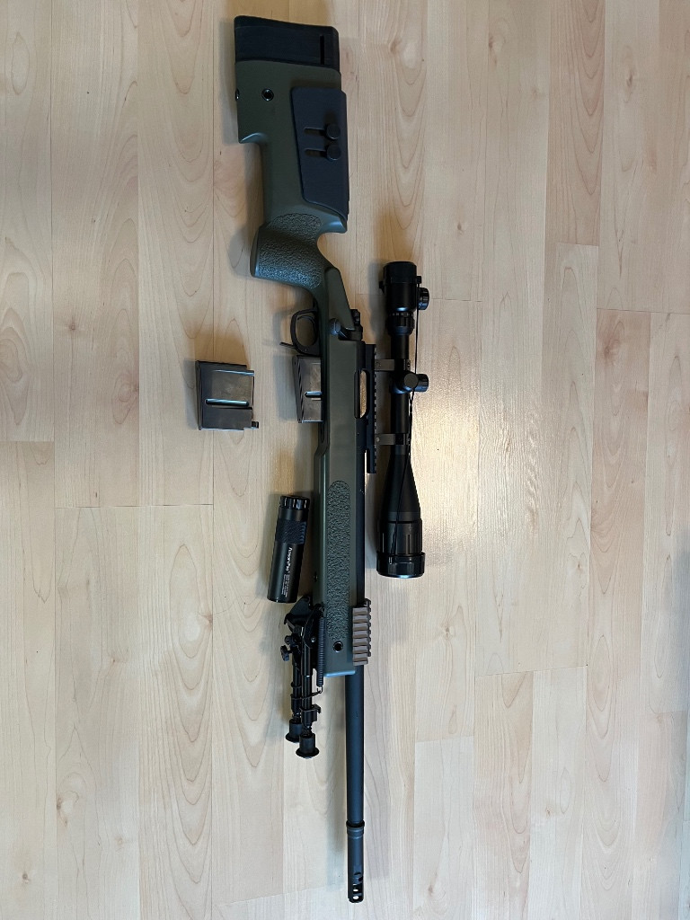 Dobrý den, prodám odstřelovací pušku od firmy VFC. Zbraň je v plném upgrade od firmy wii-tech a sestavoval ji profík a je super stavu. důvod prodeje: na airsoft již nemám čas. Ke zbrani je kufr,2x zasobnik těsní, tlumic,nozicky, montazni lista,optika, take 0,48g bls, plnicka+ puvodni dily a nove hop gumicky. Zbran byla provozovana na plynu od znacky abbey brut sniper. Vykon stavitelný pomoci npasu v zaveru. Idealne osobni prevzeti.