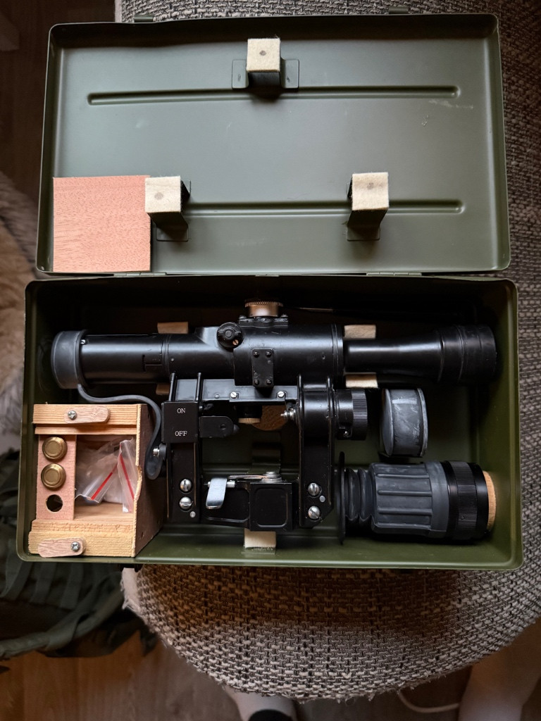 Zdravím, prodám PSO, dodávané k odstřelovacím puškám Type 1985 (SVD). Byla včetně pušky koupena nová, na SVD však používám POSP a tak je škoda aby ležela ve skříni. Puškohled má stejně jako první PSO funkční IR clonu pro detekci infra přísvitů. Záměrná osnova s originálním dálkoměrem na postavu 1,7m ne 1,5m jako PO od NPZ. K optice originální kufr s příslušenstvím, očnice, šroubovák, štěteček, náhradní žárovky a baterie. Drobná dohoda na ceně možná. Případně vyměním za střelivo 7,62x39/ 7,62x54R/ 5,45x39 / 308 win (pouze zcivilněné)