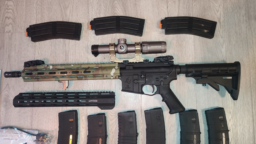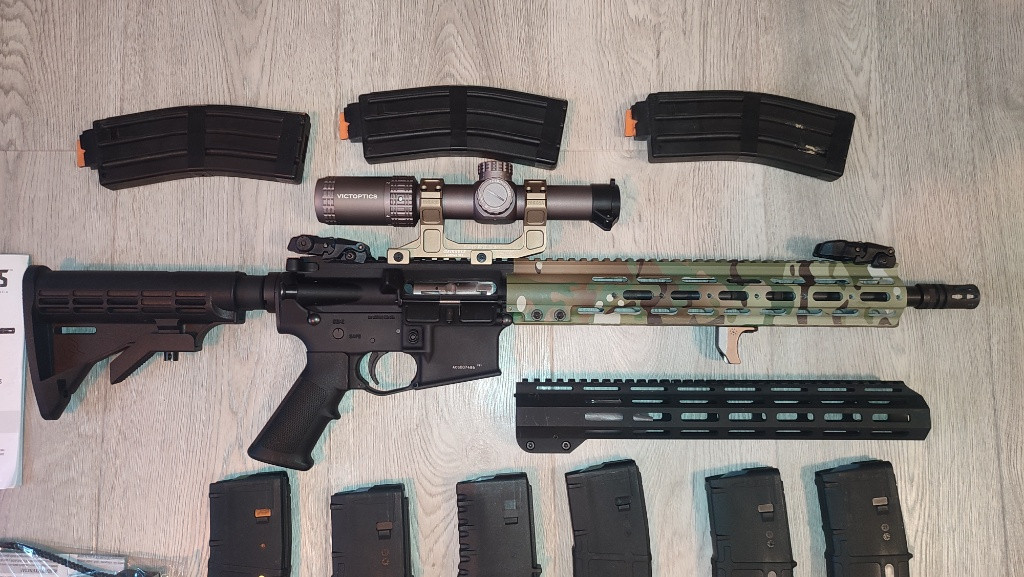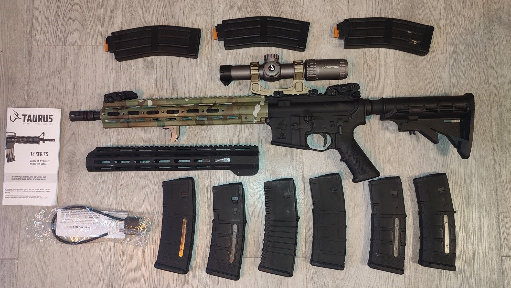Prodám Pušku samonabíjecí Taurus T4 cal. 223 Remington 14,5" (platforma AR-15). K pušce je Konverzní sada pro AR15 CMMG Bravo .223Rem na .22LR se třemi .22LR zásobníky. Funguje s ní výborně. Levné tréninkové střílení. Doporučuji střílet malorážkové střelivo s poměděnými střelami, kvůli nižšímu otěru olova v hlavni. K pušce jsou dvě předpažbí. Původní M-Lok Taurus a kopie Geissele SMR Mk1. Dále celkem 6 zásobníků - 1ks původní Taurus a 5ks Magpul PMAG. Všechny na 30 ran. Pevná výklopná mířidla typu Magpul MBUS (značení mají, ale za originalitu neručím, byly už k pušce). Pušku prodávám bez optiky na fotce, ale nechám k ní Rifle Scope mount (kopie Geissele). Na předpažbí SMR Mk1 je handstop typu Arisaka (je to replika, ale provedení kvalitní). Více fotek až budu zpět doma. Původní pořizovací cena se vším 43.000,- Kč. Nabízím komplet za 35.000,- Kč. V případě rychlého jednání se nebráním rozumné domluvě. Pouze prodržitele ZP s příslušným oprávněním, s nákupním povolením (na zbraň a na adaptér) a povolením na nadlimitní zásobníky.