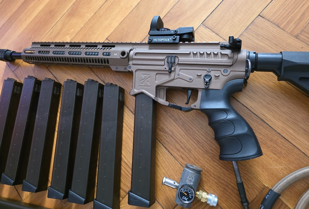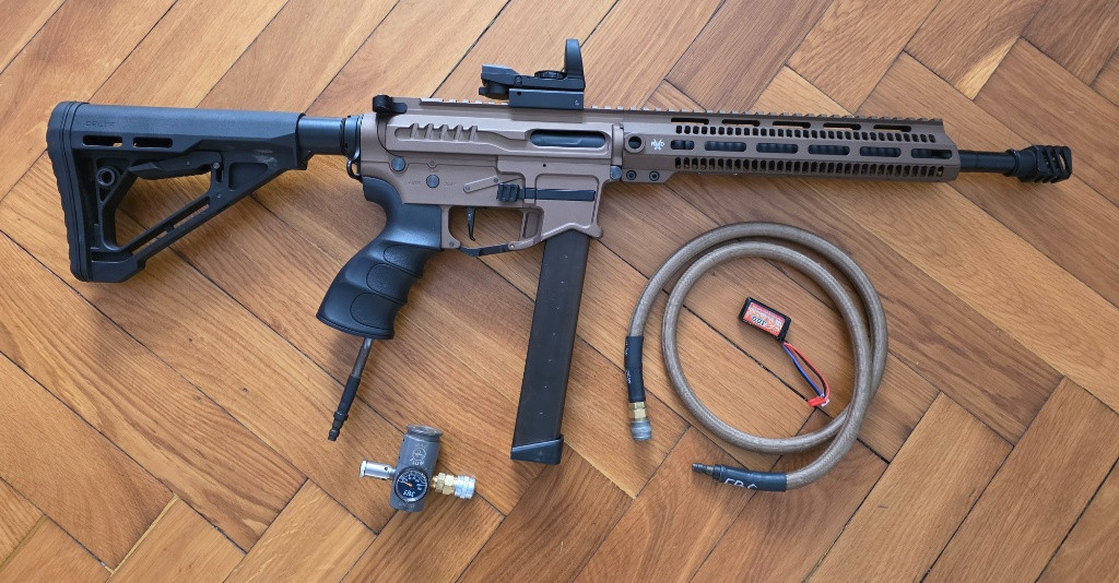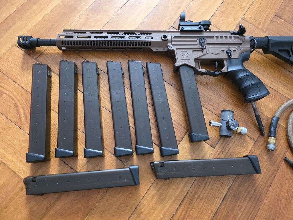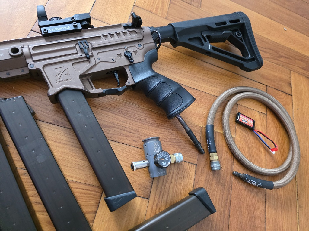 Prodám tuhle parádní hračku s polarsta f2, retro hopka, delší přesná hlaveň, kopa zásobníků od novra, kolim, regl a hadice epes plus hliníková láhev.