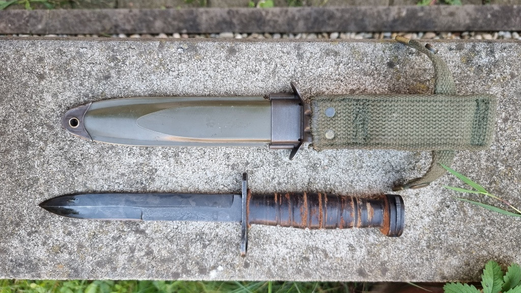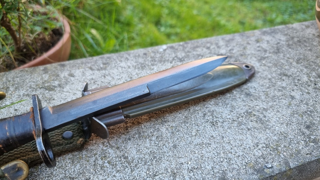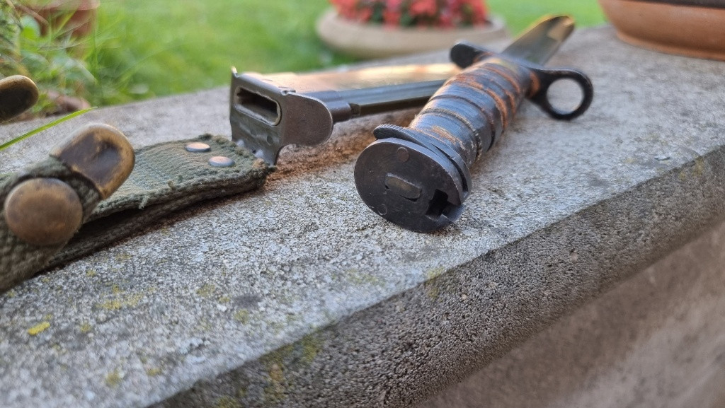 Pro US M1 carbine vzácný bodák USJ-M4 výroba S.I. pouzdro US M8 PWH. Bajonet vzácnější varianta s úzkou rukojetí u konce. Období : konec WW2 a válka v Korei.