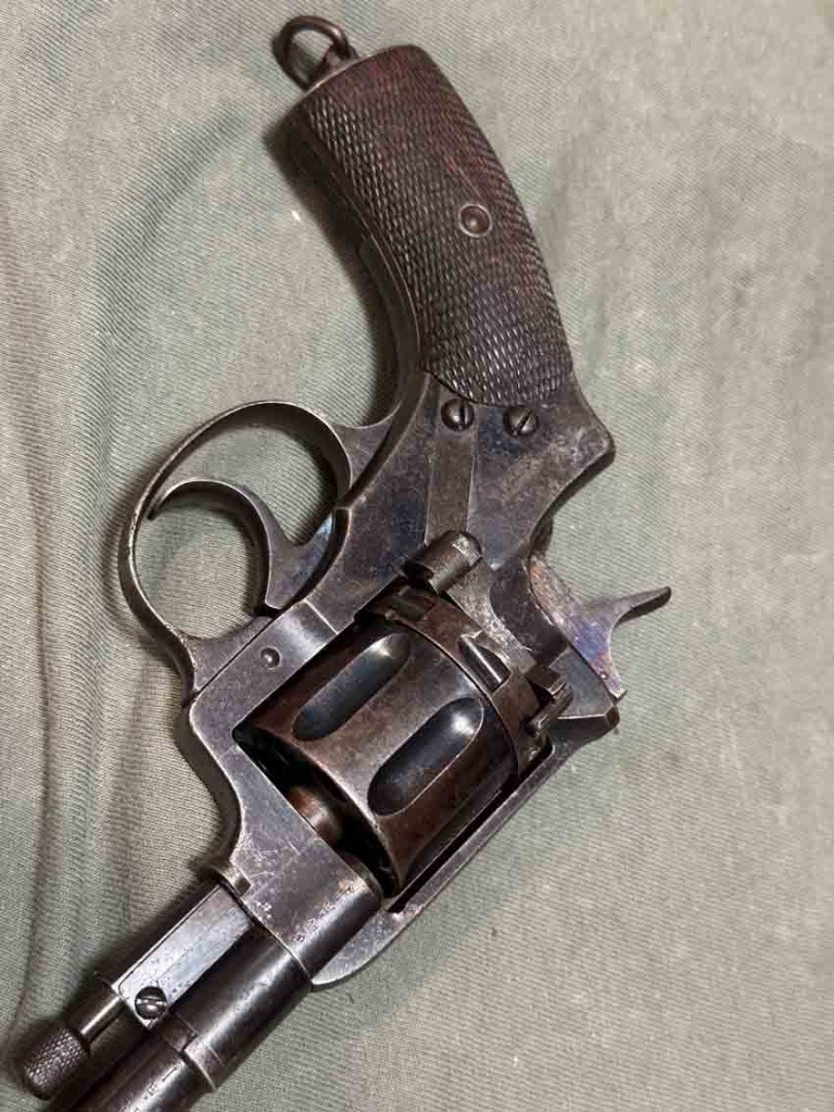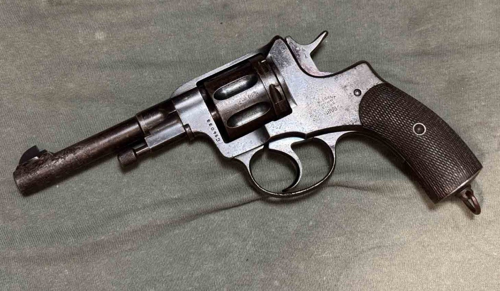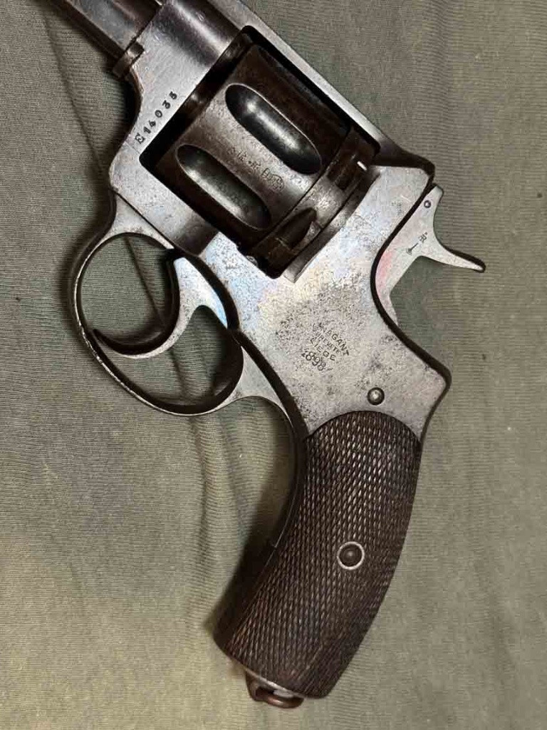 První z prvních slavných tzv. ruských Nagantů M95 vyrobených ještě v Belgii před výrobou v Rusku. Revolver je sčíslovaný, původní brynýr se zbytky hlubokého modření, bez pozdějších úprav (žádná skládačka), hlaveň je lesklá s ostrými drážkami. Revolver má platnou původní tormentaci! Povrch má patinu, u hlavně tečky koroze od uložení v pouzdře. Moc se jich nedochovalo a dnes se téměř neobjevují. ZO a NP podmínkou.