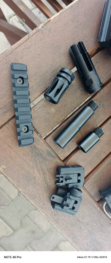 Viz foto, mířidla, prodloužení hlavně, kompenzátory, kovové tělo styl vltor v něm kompletní mech s ALU vzduchotechnikou a základní prockou, tlumiče, pažba M16 a pažba ICS uksr sniper ceny dohodou