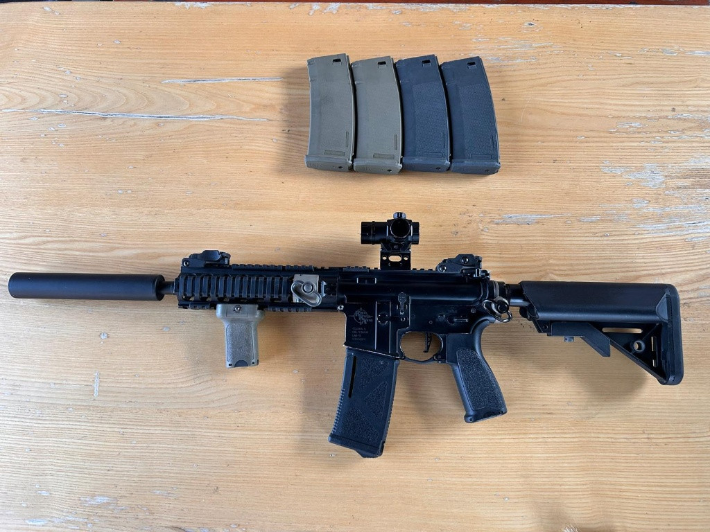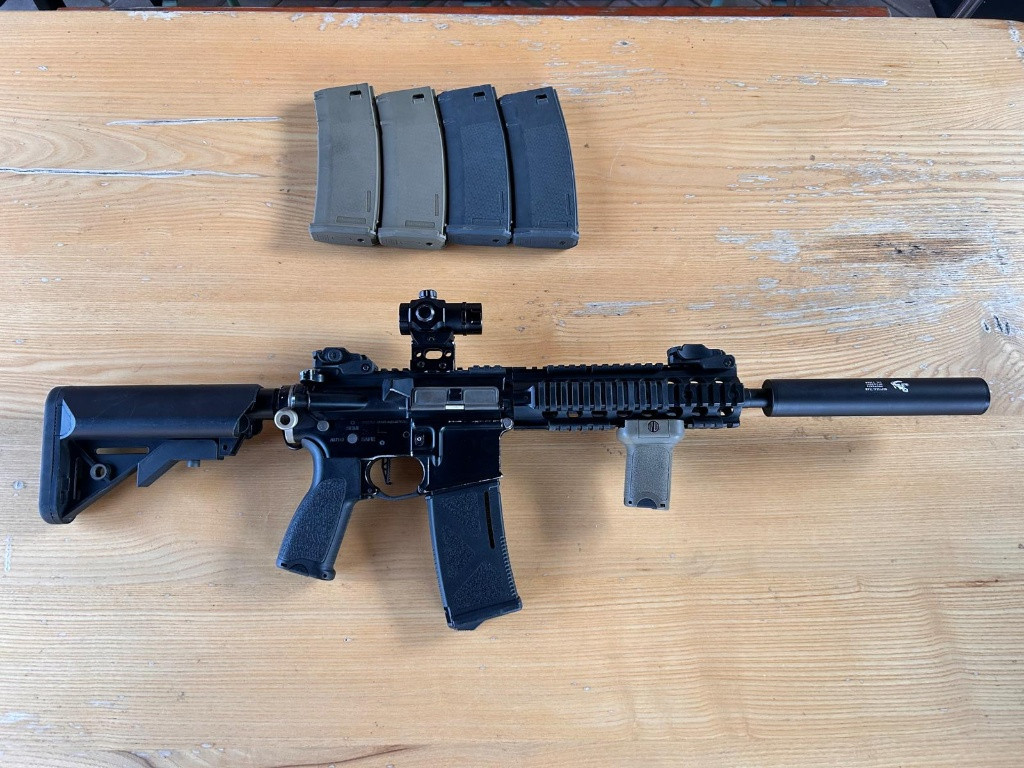 Prodám celokovovou M4 od Specna Arms v licenci s ražením Rock River Arms. Kromě motoru se jedná o kompletní upgrade a to je : CNC mechabox od Retro Arms, kompletní vzduchotechnika SHS/Epes ( tryska, píst, obě hlavy, válec, trn, pružina m120 ), CNC kola 18:1, procesorová jednotka Gate Aster s rychlospuští, Prowin komora, nerezová hlaveň, lepší hop guma. Teď zvenku: sklopná mířidla, red dot od Theta Optics, ris rychloupínací oko na předpažbí, druhé u tubusu, crane pažba, grip, gumové krytky ris lišt, tlumič a tvarovaná krytka lučíku spouště. Zbraň naprosto bez problému, plně funkční, odladěná na 1.7J. Vnitřnosti připraveny na silnější pružinu. Ke zbrani je 5x tlačný zásobník, origo krabice a certifikát. Tak jak je na foto vyšla skoro na 20 000kč. Cena 10 000kč. Neměním.