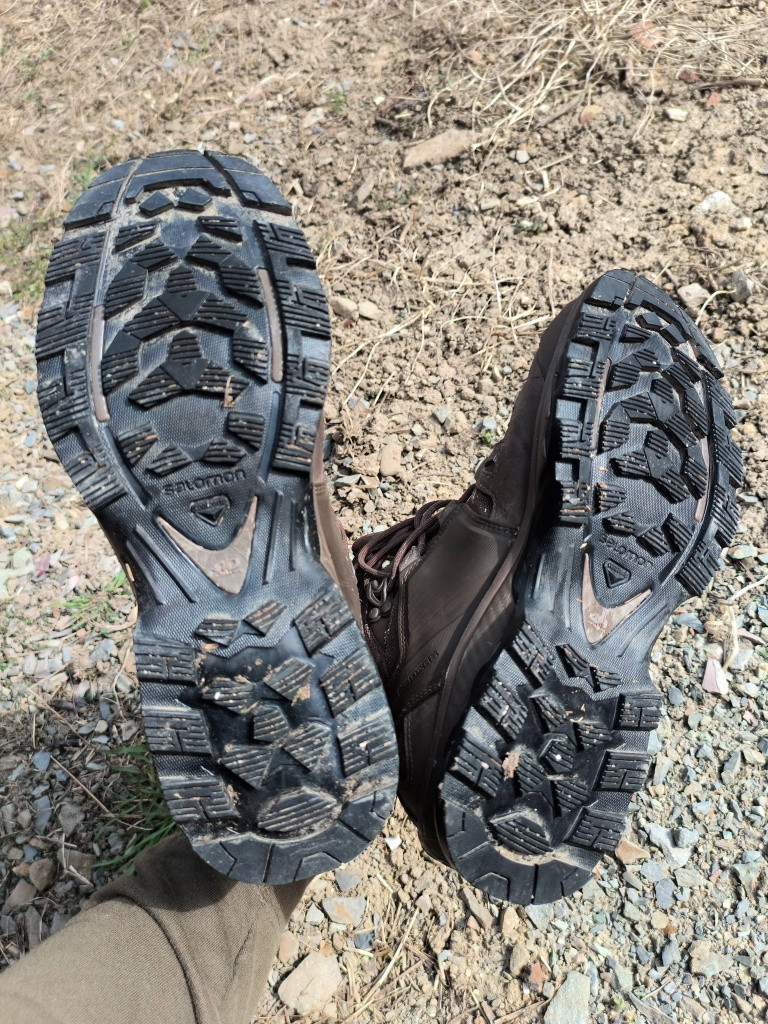 Nošené minimálně, podcenil jsem velikost a tlačí mě. Kůže ošetřována, podrážka a tkaničky bez závad. Bohužel se mi podařilo v lese zapíchnout nějaký drát do gumové části podešve a je tam menší dírka viz. foto. Na funkci boty nemá vliv. Velikost: 9 (43 1/3)