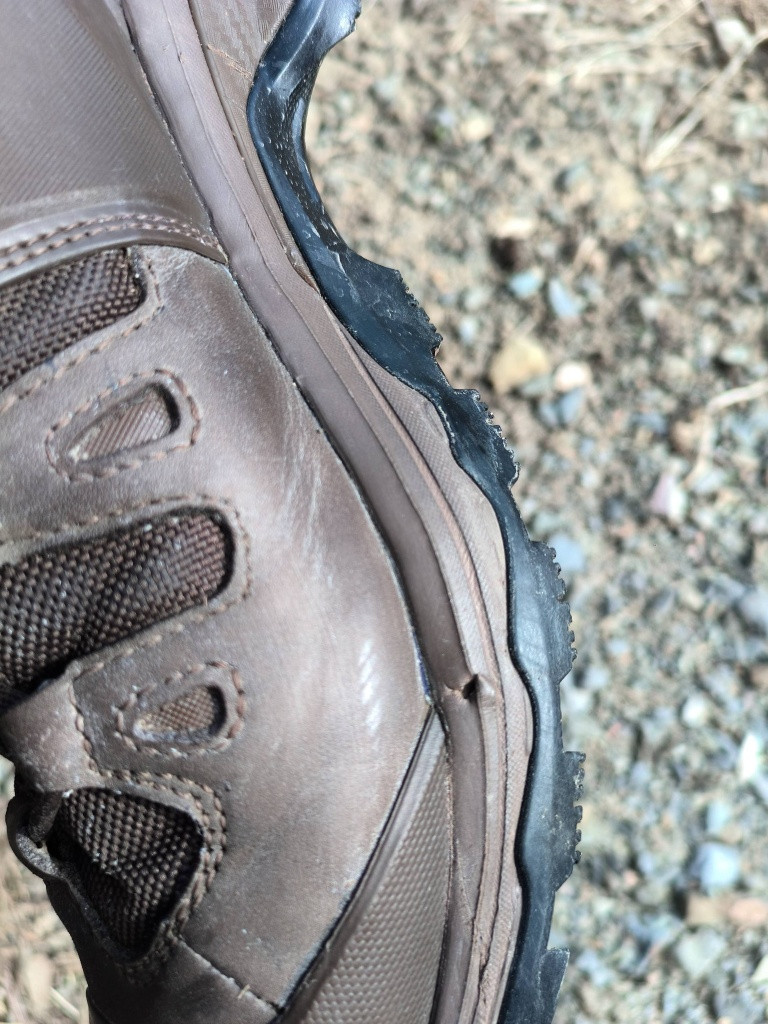 Nošené minimálně, podcenil jsem velikost a tlačí mě. Kůže ošetřována, podrážka a tkaničky bez závad. Bohužel se mi podařilo v lese zapíchnout nějaký drát do gumové části podešve a je tam menší dírka viz. foto. Na funkci boty nemá vliv. Velikost: 9 (43 1/3)