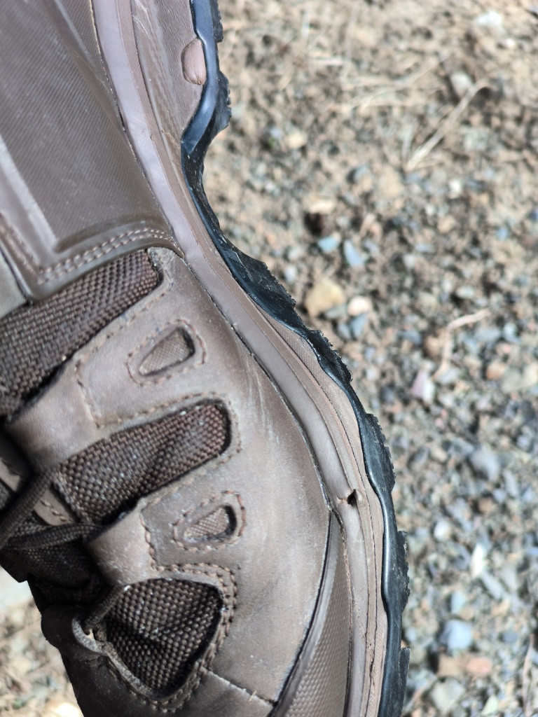 Nošené minimálně, podcenil jsem velikost a tlačí mě. Kůže ošetřována, podrážka a tkaničky bez závad. Bohužel se mi podařilo v lese zapíchnout nějaký drát do gumové části podešve a je tam menší dírka viz. foto. Na funkci boty nemá vliv. Velikost: 9 (43 1/3)