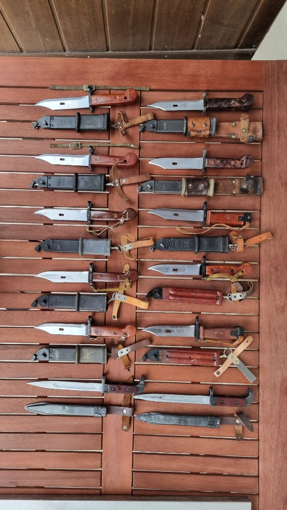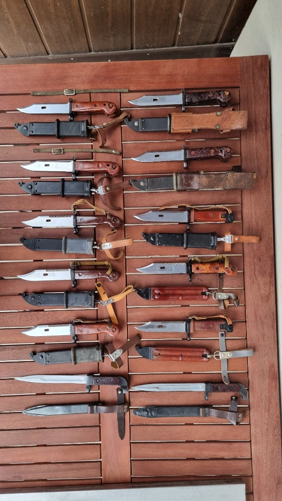 Prodám celou sbírku bajonetů na AK viz foto. Nejlépe jako celek. Prosím pište nabídku ceny do mailu. K osobnímu prohlídce nebo předání na Tišnovsku nebo v Brně po dohodě