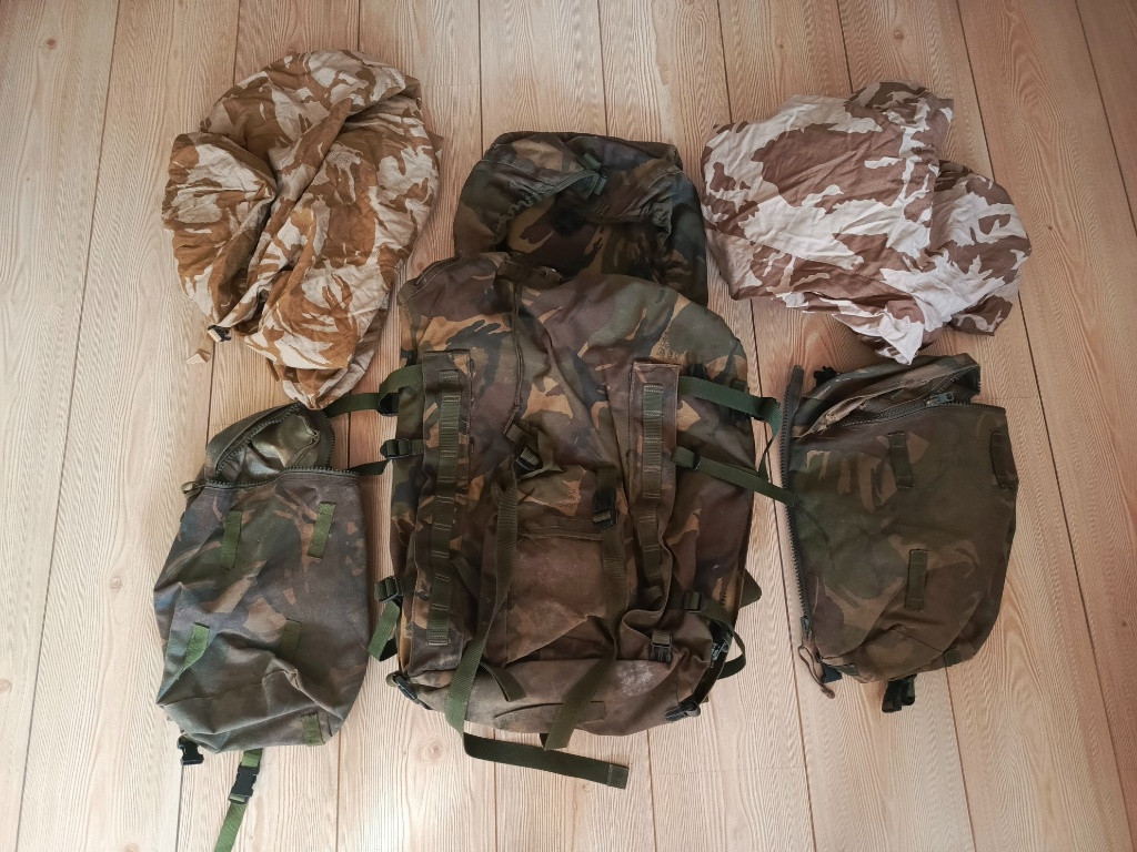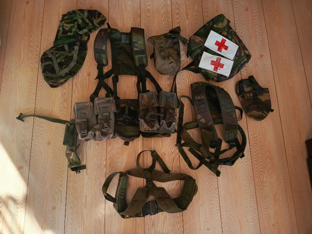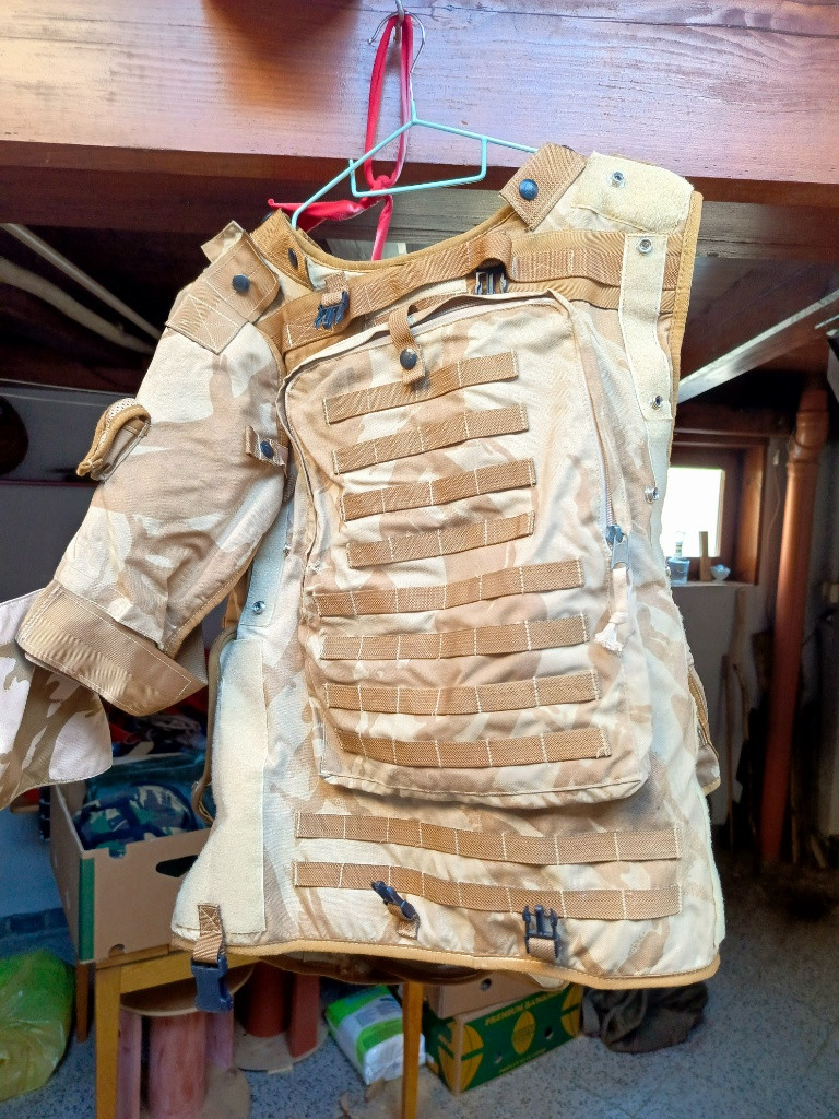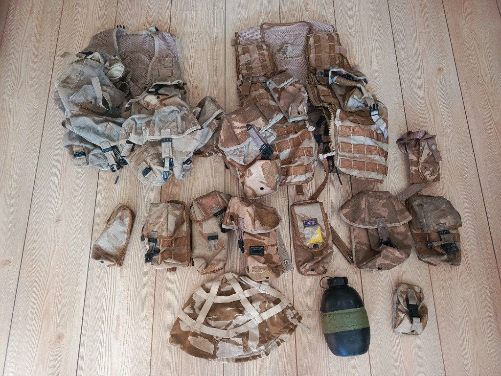 Prodám sbírku výstroje britské armády DPM les poušť viz foto. Taktické vesty plus doplňky , kapsy, batohy 3day i Bergen + boční kapsy, originál helma MK6 plus potahy , Osprey vesta poušť. Vše na fotografiích. Jako celek , je toho 5 banánových krabic. Cena 5 tisíc Kč , možnost jednat . SMS