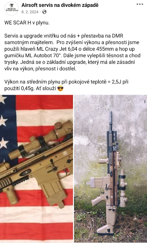 Prodám nebo vyměním Scar H od WE, laďeno od AS Divoký západ, výkon 2,5J s 0,45g kulema. Ke zbrani 5x zásobník. Prodám či vyměním za pěkné dmr v 5,56.