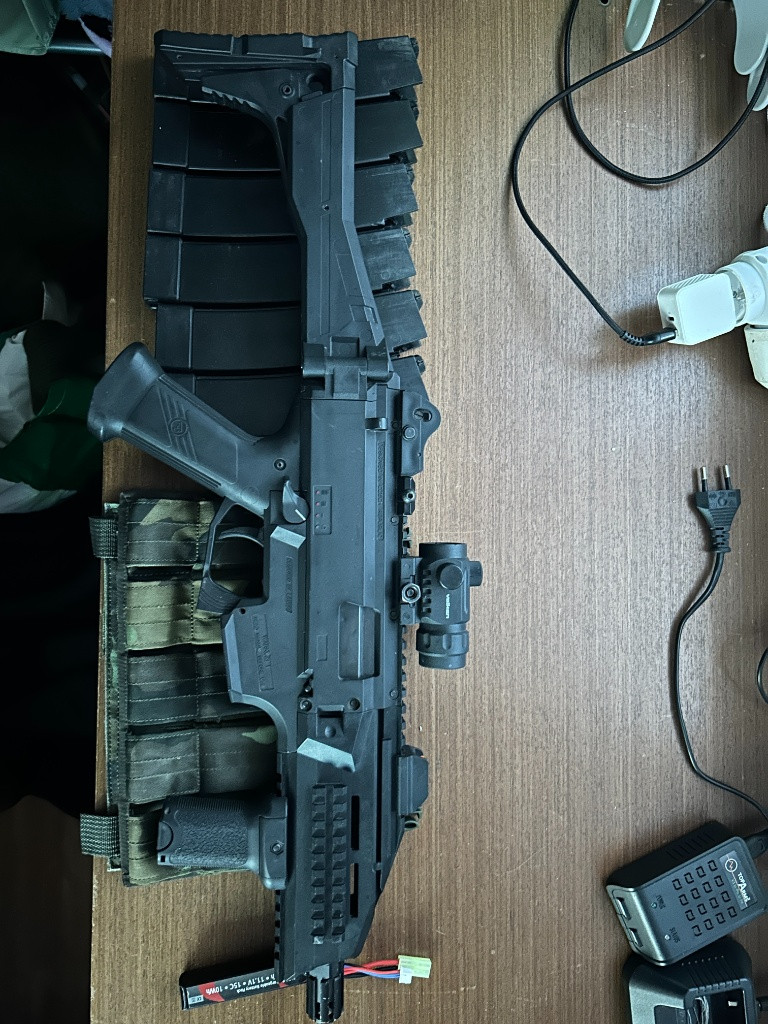 Prodám Scorpion EVO3 A1 v dobrém stavu od ASG. EVO je v pořádku, ale sem tam má nějaké oděrky a škrábnutí z používání, ale nic hrozného. Prodávám z důvodu, že jsem se vážně zranil při fotbalu a už v mém aktuálním stavu nemá smysl běhat s tímhle malým peklem po hřišti a kropit vše, co se pohne. K "škorpíkovi" přidám: 6x tlačný originální zásobník 1x kolimátor 1x rukojeť 1x očko na popruh na RIS lištu 1x sumku na 5 zásobníků Do EVA jsem nezasahoval, všechno je originální z továrny, krásně vše funguje a je jak má. Můžu ještě přidat nabíječku a originální baterku (jiná tam nepasuje, osobně vyzkoušeno) + nový pytel 0,25g kuliček dohromady za 500 Kč. Zásilkovně se nebráním.