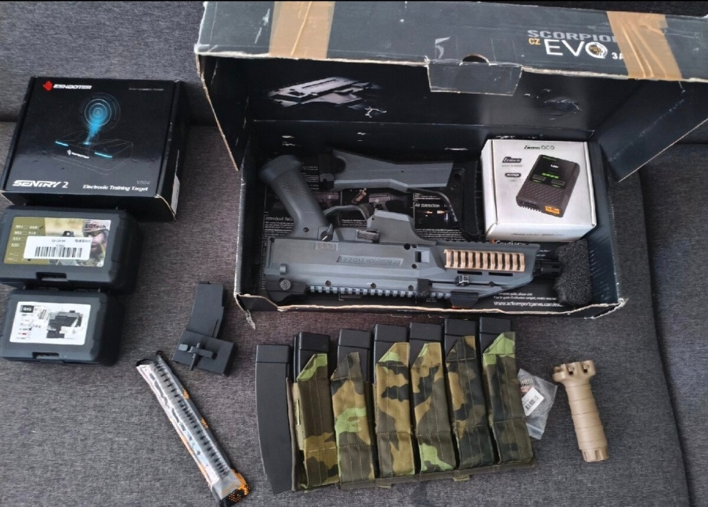 V případě výměny: pošli foto s info na email nebo WhatsApp.... Nechci HPA ..ANI AK ... SPÍŠE KULOMET..STORM PC1.. AR-15 NEBO NECO ZAJÍMAVÉ na m4 zásobníky Výměna nejlépe Osobní předání v Bílině a okolí Další info WhatsApp nebo email Pouze vážný zájemci! Na zbytečné otázky nereaguji.... ⬇️⬇️Vše důležité je tu vypsáno⬇️⬇️ Scorpion EVO - MAXX Upgrade + 7x zásobník a sumka Prodám Scorpion EVO od ASG. Ve zbrani je pár úprav. MAXX komora a tryska + ocelová podložka pro vymezení vůle pažby. Ke zbrani přidám 7 tlačných zásobníků a sumku od AS-TEX. Zbraň střílí krásně a výkon je na 1,5- 1,6J podle kulí. Jediný nedostatek (možná výhoda) je vyřazení funkce přebíjení při prázdném zásobníku. 1x Scorpion evo 1x baterie 11.1 1x sumka na jeden zásobník .. vz.95 1x sumka na pět zásobníku... Vz.95 7x zásobník... Tlačáky.. 1x Měřič napětí akumulátorů 1x Nabíječka IMARS mini G-Tech USB-C 60W - Gens Ace 1x Vertikální taktická rukojeť 1x redukce pro tlumič 1x Redukce na M4 zásobníky (3D tisk..).... Nízkoprofilové krytky na RIS lišty laserový dálkoměr Při seriózním jednání přihodím ještě elektrický terč zdarma.. Cena se odvíjí dle vybavení a příslušenství Kolimátor, optika, tlumič nejsou součástí prodeje ????♂️ Cena za vše 11 000 Kč