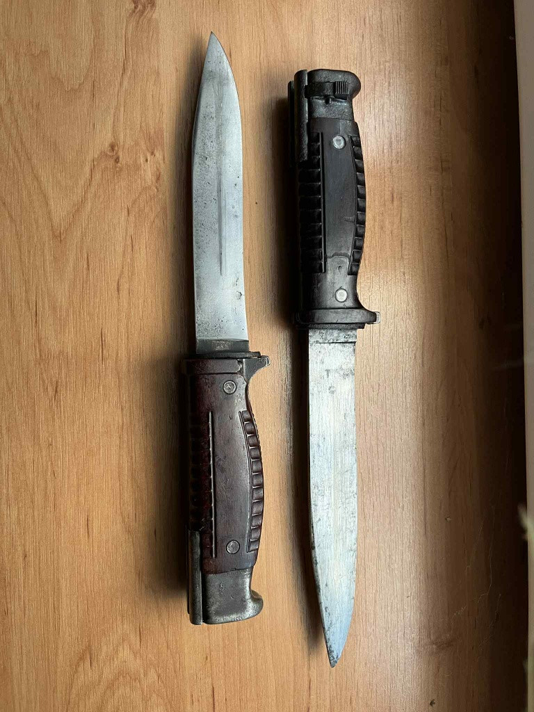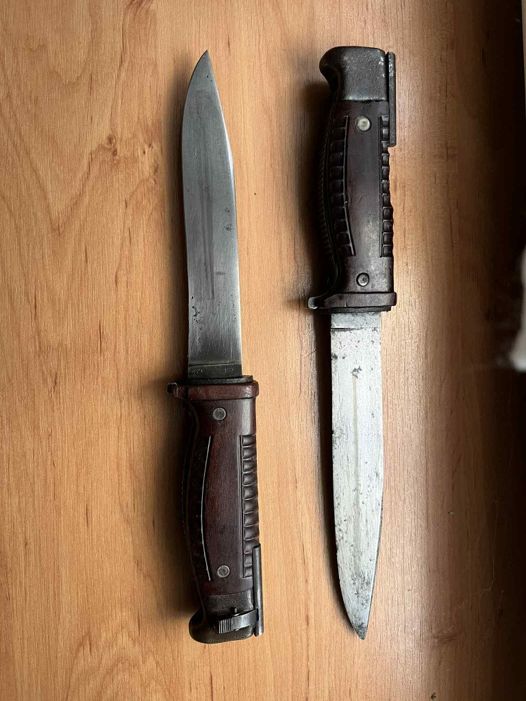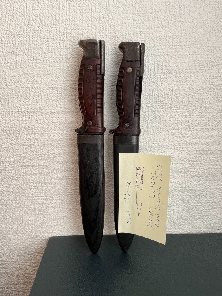 Rarita originál SG42, bodák, bodáky, bajonet MKB42 Prodám dva originál velmi vzácné německé bodáky SG42. Značení viditelné, stiskátka funkční, jdou nasadit na pušku. Ke každému bodáku přidám jako bonus replikovou pochvu a nářadí. Za originalitu ručim vracením peněz. Velmi obtížně sehnatelná záležitost i v absolutně špatném stavu. Cena za jeden kus je 45 000Kč. Ceny kompletních nožů v tomto stavu začínají na nějakých 4-5000Euro... Výměna s doplatkem je možná, chápu že to není levná záležitost. V případě zájmu vice info email nebo telefon.