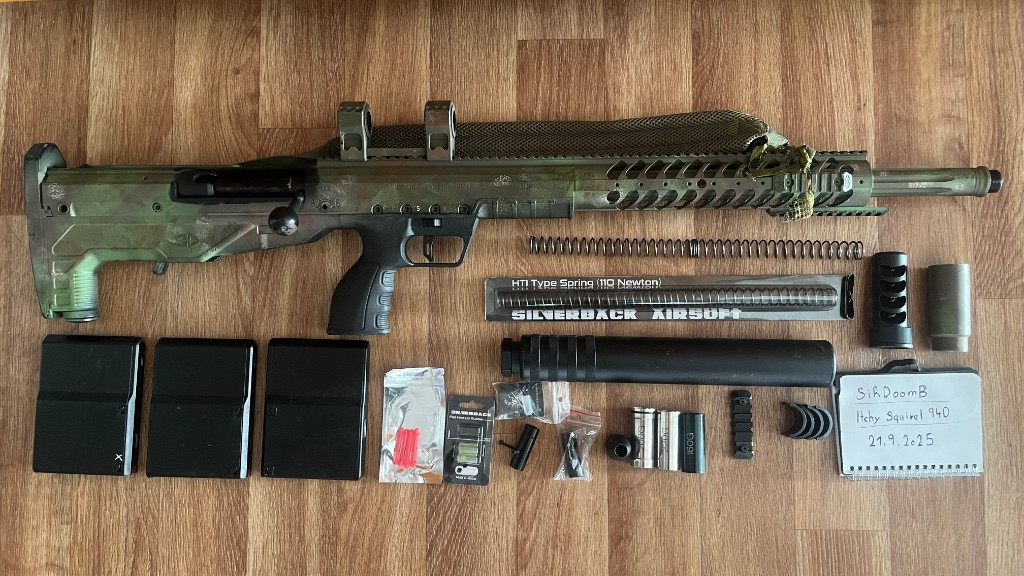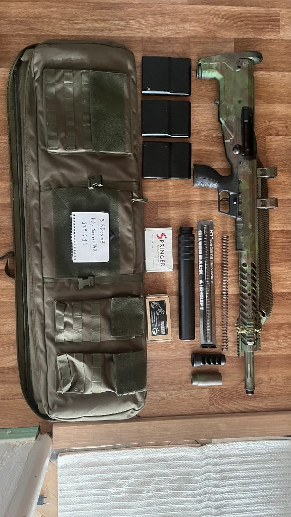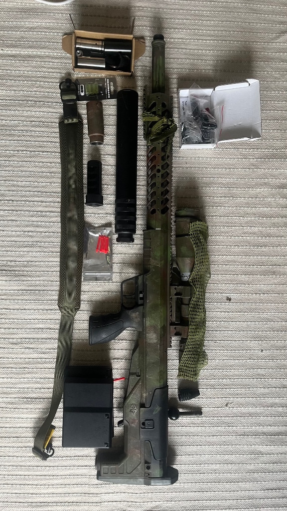 Zbraň je v upgradu: Maxx komora, Silverback 70 aeg hop up gumička, EDGI píst, CNC hlava pístu s mousefartem, 110N pružina (přidám dvě slabší), FPS kroužky, hlaveň základ. Doplňky: DTSM montáž optiky, Elite Iron Alpha tlumič s výplní, CNC amplifier, dvě různé hlavy natahovací páky, 2 plus 1 zásobník, popruh, vak na zbraň, Optika Vector 4-16x50 aoe. Náhradní díly: followery zásobníku, náhradní hop upo gumičky, hop komory (základ plus fast komora) a pár dalších drobností. Výkon tak jak je cca 3.3-3.4J dá se regulovat podle vašich limitů Pořizovací cena byla za komplet vše přes 2 000 euro. Výměna je možná za např. VFC MK17, nebo vfc mk13 eglm granátomet, či noční vidění.