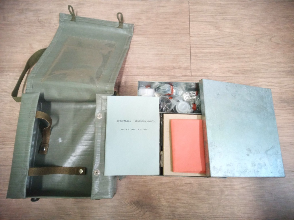 Prodám opravárenskou soupravu OS-I-CO obsahující náhradní díly, spotřební materiál a nářadí k opravám prostředků protichemické ochrany. Pěkný retro kousek z období ČSLA ve stavu nové věci. Dále zdarma přidám dva kusy látkového overalu (chladícího převleku) pod speciální ochranný oděv SOO – CO a pár rukavic.