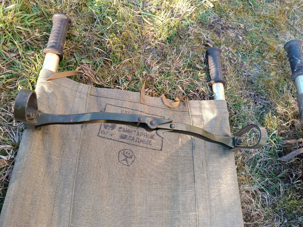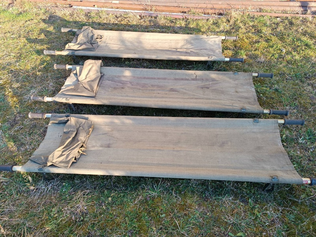 Originál sovětská sanitární skládací nosítka (носки санитарные складные) z SSSR 1979 (štítek Medexport čitelný). 1 ks: dobrý stav, kompletní funkční 2 ks: poškozené kování, v otevřeném stavu drží, v zavřeném chybí západka (zdarma k prvnímu kusu) Pouze osobní odběr všech kusů