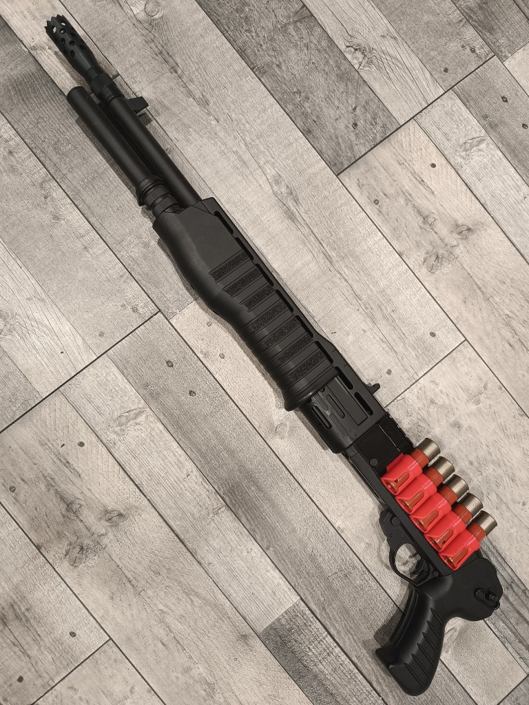Prodám tuhle manuální brokovnici, u mě jen vystavená. Výrobce neznámý, střílí po 3BB. Vytištěný kompenzátor a držák na patrony.