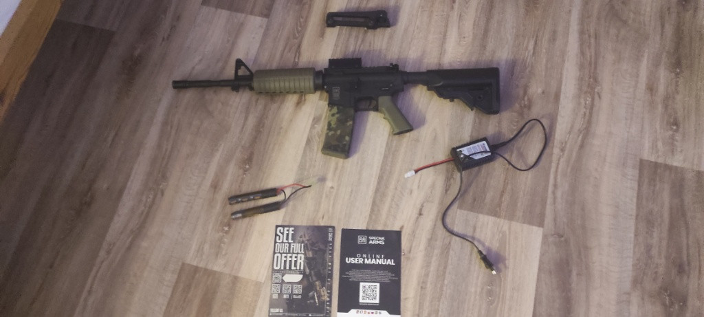 Je to elektrická m4a1 je v ní lepší pružina a ještě něco myslím jinak střílí perfektně je k ní teda pouze jeden zásobník ale mě to vždy vystačilo je točný mohu přidat chránič na pusu (brýle ne) a celkově je to dobré do začátku nebo už i pro pokročilé já airsoft hrál už 4 roky a jinak perfektní měnil jsem baterií pažbu a nabíječku mám i originální krabici přímo od specna arms