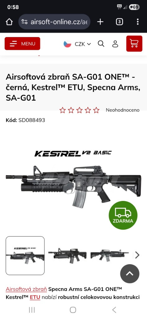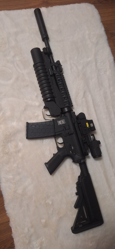 Specna Arms SA-G01 ONE™ (Kestrel ETU) – Stav nové zbraně + granát,kuličky cca1500ks,plyn Prodám celokovovou airsoftovou zbraň SA-G01 z řady ONE od Specna Arms. Zbraň byla zakoupena minulé léto, sloužila pouze jako vystavený kus a bylo z ní vystřeleno jen pár zásobníků na zahradě. Stav nové zbraně, bez škrábanců, vnitřek netknutý. * Elektronika: Integrovaná procesorovka Kestrel™ V2 Basic (programovatelná spoušť, ochrana baterie, diagnostika). * Vylepšení: Instalováno horní RIS předpažbí, sklopné přední mířidlo (původní pevné mířidlo zavazelo ve výhledu). * Příslušenství: Ke zbrani přidávám funkční plynový granát do granátometu M203, který je součástí zbraně. * Balení: Prodávám v originální krabici včetně točného zásobníku. * Poznámka: Prodávám BEZ optiky a magnifieru (kolimátoru na fotce) a tlumiče. Možnost vyzkoušení: Při osobním převzetí rád předvedu funkčnost se svou baterií, aby bylo vidět, že elektronika i zbraň šlapou na 100 %. Cena: 5 500 Kč