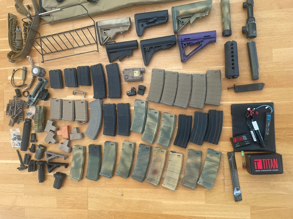 Ve zbrani se nachází Retro Arms mech, Retro tryska 21,4, Action Army hlava válce v2, Guarder plný válec, Guarder SP120 pružina, Guarder Infinite Torque-Up zátěžový motor, Action Army 6,01 přesná hlavěň, ProWin hop komora, Begadi soft gumička, ASG CNC Ultimate 16:1 kola, ASG Ultimate 8mm kuličková ložiska, Gate Aster procesorovka, původní flat type spoušť co byla ke zbrani. Osazení na zbrani je kolimátor Vector Optics Maverick 3 se zvýšenou montáží od Novritsch, Vector Optics Magnifier MAVERICK-IV MINI 3x22 SCMF-41, STRIKE taktická svítilna WL1080 s RIS montáží 1080 lm, Zbraň dává 2,5 J s 0,36 kuličkama, upgrade bylo prováděno od kluků z PUNG airsoft servis kdy mi to skládali dohromady, drobné vnější úpravy Fidelem z anáče. Zbraň je nová, má vystříleno maximálně 2000 kuliček a to převážně na zahradě nebo ve skladu kde jsem pracoval, chtěl jsem znova začít se softem ale nakonec z toho sešlo a od té doby to mám schované ve skříni přes rok. Rád bych kdyby se někdo našel kdo mi pomůže se toho zbavit v celku. Ke zbrani přidám 30 kusů různých typů tlačných zásobníků, všechny podávají dobře bez problémů a jsou převážně nové. Nějaký pažby navíc, spodní tělo od Specny s ražením DD, 5Ku tlumič i s ocelovým 3-prong flash hiderem, [Z-Parts] M4 Forward Rail For Front Triangle Sight Base, AnPeq 15 kopie se svítilnou a laserem, náhradní mířidla, krytky na RIS, nějaký ty ručky gripy, popruhy od WOSPORT, obal na zbraň WOSPORT, stojan na zásobníky, baterie 11,1V od Sony a Titanu, TITAN Li-Pol / Li-Ion nabíječka DIGITAL CHARGER, obal na lipol baterie a nějaké ty drobné dílky navíc. Prodávám pouze jako komplet. Zájemci piště. Preferuji osobní odběr.