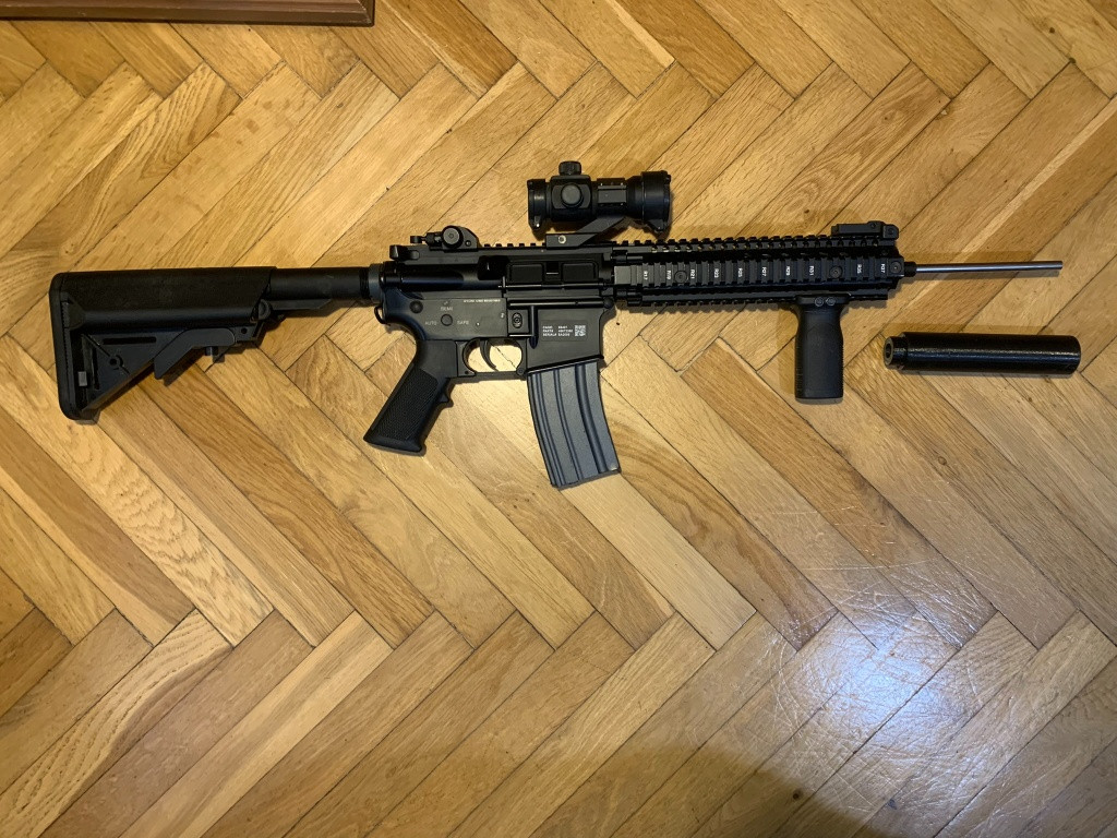 Popis: Prodám airsoftovou zbraň SA-A03 ONE™ - černá, Specna Arms, SA-A03. Zbraň je celokovová s CNC RIS předpažbím, nastavitelnou Crane pažbou (možnost různých baterií) a kvalitním mechaboxem V2 se systémem QSC / Enter & Convert™ (rychlá výměna pružiny). Fabrická pružina M120 — úsťová rychlost cca 135 ±1 m/s (~1.8 J). Délka zbraně nastavitelná 700–785 mm, hmotnost ~2580 g. V ceně: - Zbraň Specna Arms SA-A03 — použití velmi nízké (cca 7 akcí), výborný stav. - Rezervní pružina M90 pro CQB. - Nabíječ Li-Pol baterií B3 Pro Compact. - 1x originální + 2× náhradní zásobník - Kompletní doplňky: brýle, maska, vesta, potah na helmu, popruh a vak. - Přidávám zaměřovač — funguje, ale má špatný kontakt, koupený již použitý (doporučená oprava nebo výměna). Doplnění: zbraň prošla kompletním servisem a většinou praktických upgradů — vyměněn celý opotřebovaný piston za kovový Specna (celokov zuby), upraveny a správně podložené kola, výměna trysky za delší (AsParts), nová pružina M120 (SHS), konektory přehoděny na DeanT, nainstalován Jefftron MOSFET, řádné promazání a vyčištění, výměna válce za plný a výměna hlavně na 410 mm SRC. Hop-up guma nahrazena Super Macaron + nub, hop a komory doladěny. Důvod prodeje: Na airsoft už bohužel nemám čas, proto posílám dál. Možnost vyzkoušení při osobním setkání nebo zaslání videa, jak střílí. odkaz na airsoftový e-shop pro podrobné informace ke zbrani: https://www.airsoft-online.cz/aeg-m4--m16-- hk416/mk18mod1--sa-a03-/
