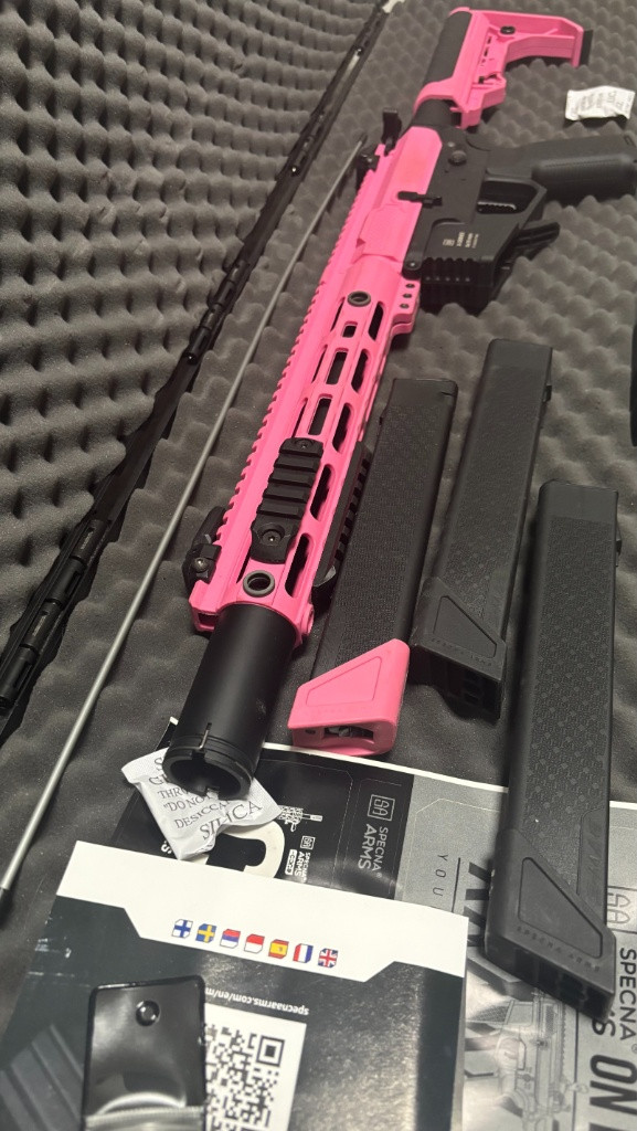 Nabízím k prodeji Specna Arms SA‑FX02 FLEX™ HAL ETU Gen.2 v růžové barvě. Zbraň byla použita maximálně jednou na akci, jinak pečlivě uložená. Jedná se o velmi těžko sehnatelný a nedostupný kus, ideální jak pro náročného hráče, tak pro sběratele. Stav odpovídá téměř nové zbrani, bez poškození, všechny funkce perfektně fungují, jediné co, tak mírně špinavé části, ale není to nic, co by se nedalo vyčistit. Součástí je standardní vybavení od výrobce + 2 zásobníky. Pouze osobní předání. O ceně jsem schopný jednat.