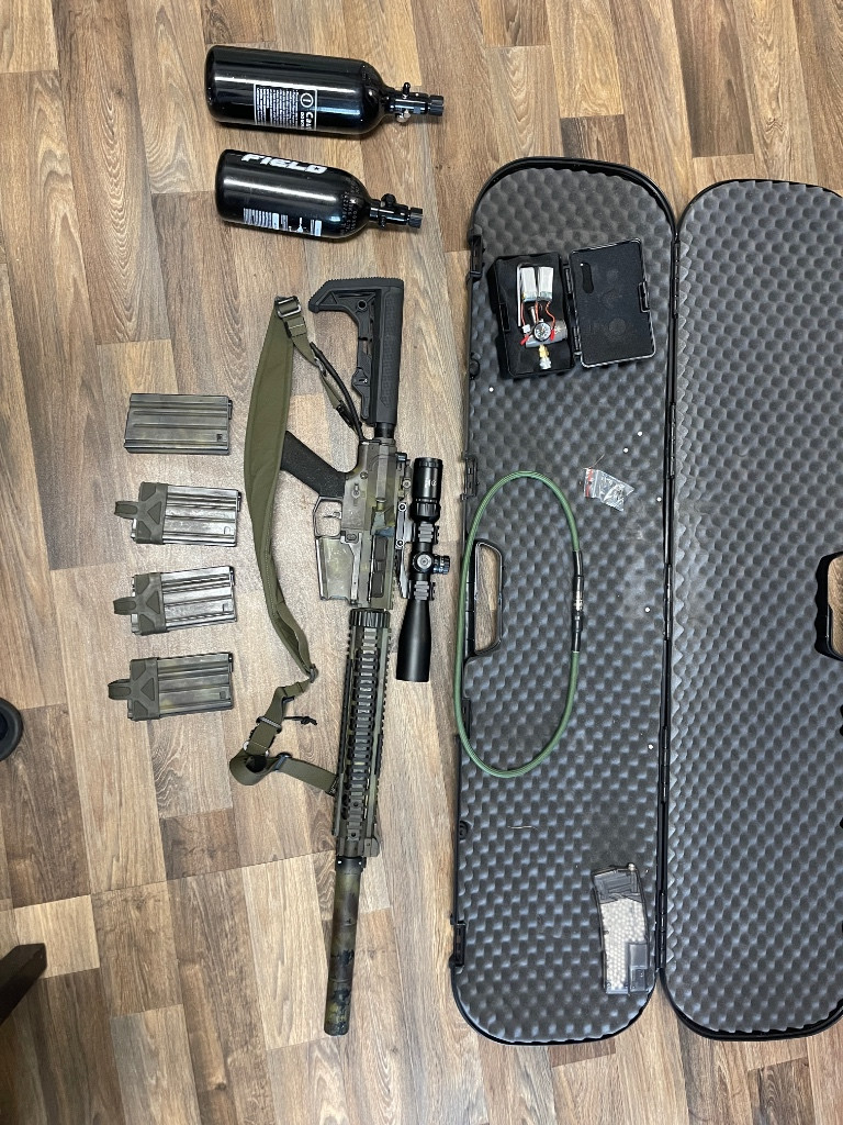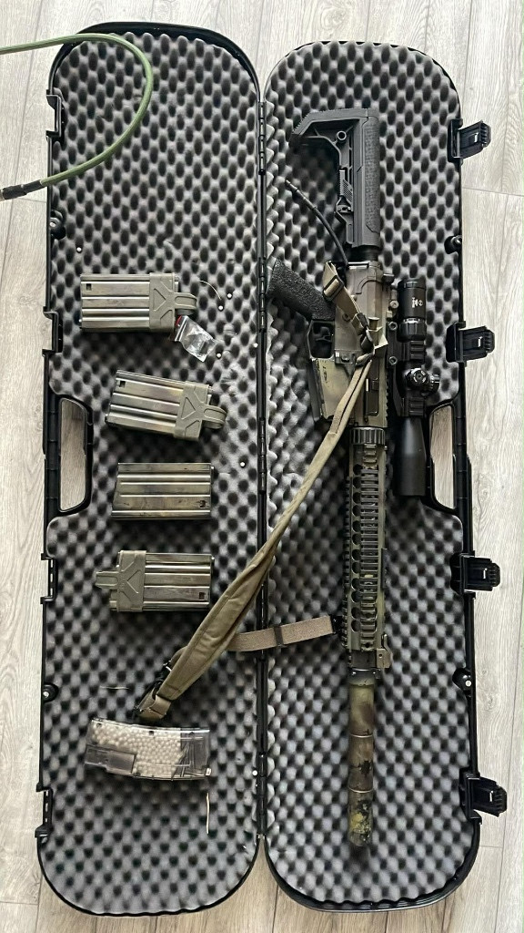 Prodám svojí SR25 (tělo Cyma platím) předělanou na HPA, uvnitř jsou následující díly: - HPA systém Polarstar F2 s tryskou pro SR25 - IGL hadice s QD foster koncovkou EPES Airsoft - Hlaveň Lambda 6.05/510mm - Hop-up Komora GATE EON - Hop-up gumička MapleLeaf Super Macaron 60° Zbraň byla stavěná u servisu AirsoftVault, má veškeré úpravy po vzoru Epesních kverů (Úprava pro mechaboxu pro IGL hadici, úprava uložení systému v mechaboxu (po vzoru Epesní hlavy válce), zvětšený chod trysky, úprava selektoru střelby, vymezení vůle+ zkrácení chodu spoustě, dorážení hop-up komory O-kroužky, vymezení vůle vnitřní hlavně, stippling pažbičky atd..) Zbraň dává výkon 1.7-5J, dle zvoleného tlaku a váhy střeliva (3.3J s 0.48g na cca~115PSI). Ke zbrani přidám kompletní HPA sestavu: Regulátor EPES Max flow, 2x HPA láhev ( Dominator 1L, Field 0.8L), HPA hadici Balistyk, 2x 7.4V Li-Pol pro HPA systém. Dále ke zbrani přidám optiku Theta Optics 3-9x40 BE,QD tlumič, 4x tlačný zásobník a rychloplničku a zbytek kuliček 0.45g Madbull. Kufr není součástí prodeje!!! Zbraň prodávám z důvodu konce s airsoftem, kvůli narození dítěte. Tudíž výměna není možná, pouze prodej!!