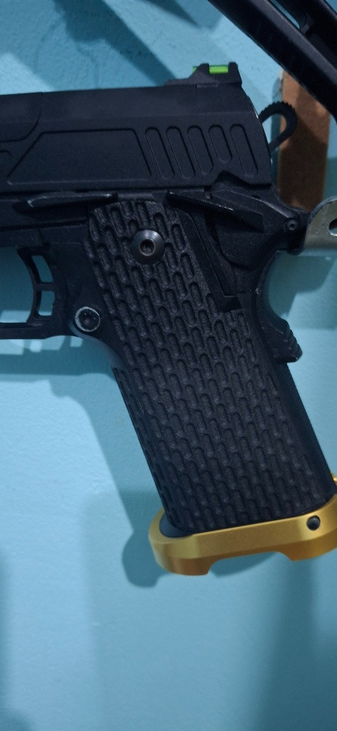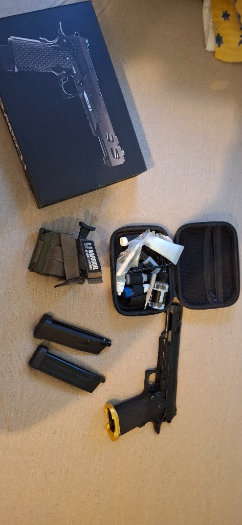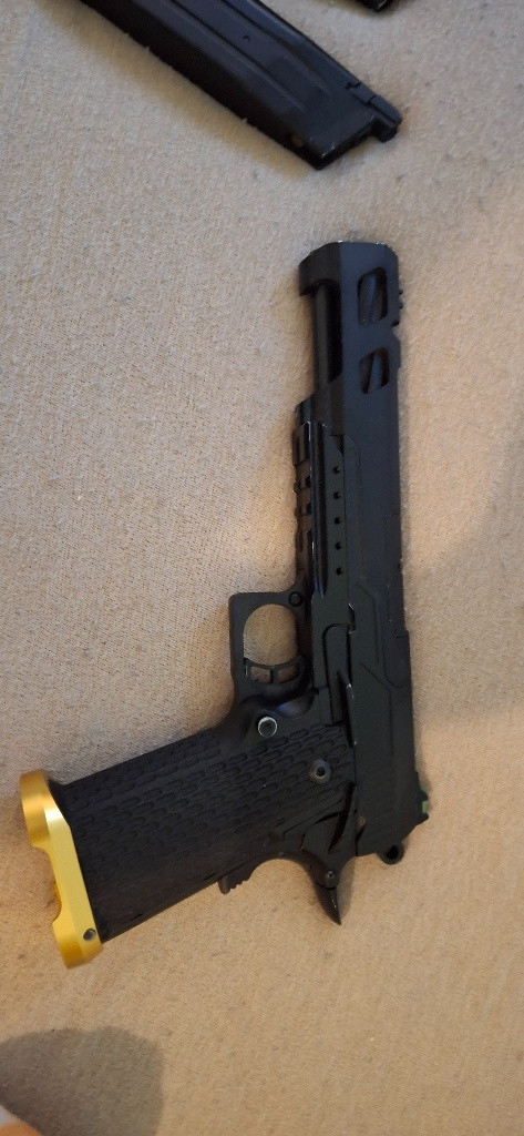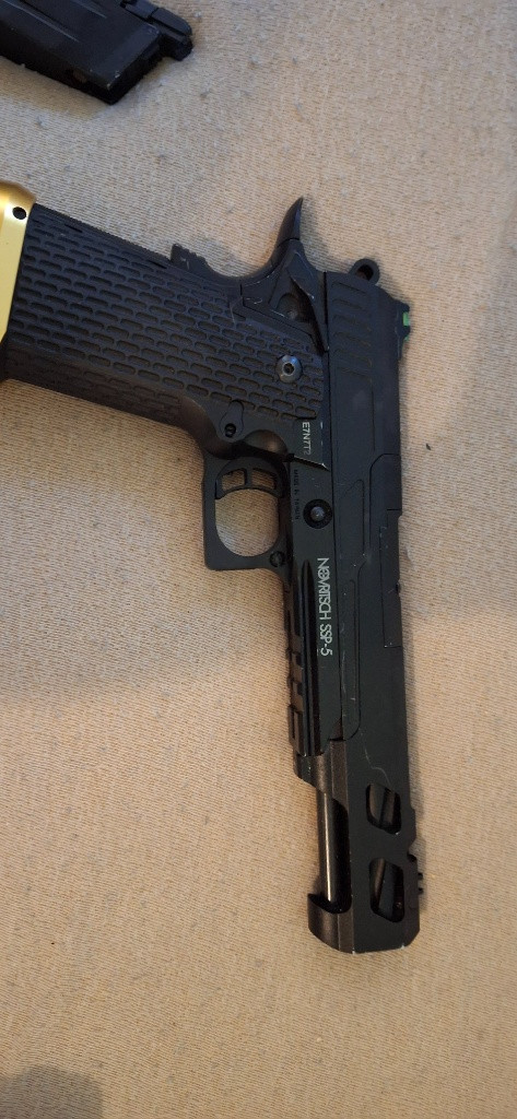 Prodávám SPP5, používaná 1,5 roku. Stav velmi dobrý — viz detailní fotografie (pouze malé kosmetické škrábance, které neovlivňují funkci). Střílí jako nová. Součást balení: SPP5 (originální provedení) 3× zásobník Pouzdro na stehno Zlatá hlaveň Zlatý rámeček na rukojeť Komplet sada na čištění zbraní