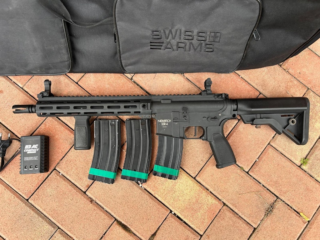 Prodám SSR-4 od Novritsche, kdo zná, ten ví. Polymerové tělo, lehké ale pevné, hezky lícuje ( nová stojí 6000kč). Zbraň již v základu má prowin komoru, procesorovou jednotku, rychlospoušť a rychlovýměnu pružiny. Dále k ní přidám lipol baterii 11.1V + nabíječku, balení kuliček, 3x zásobník, grip a transportní tašku na zbraň. Prodej pouze jako komplet. Cena 4500kč