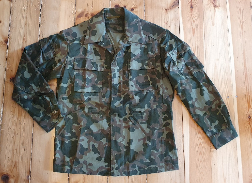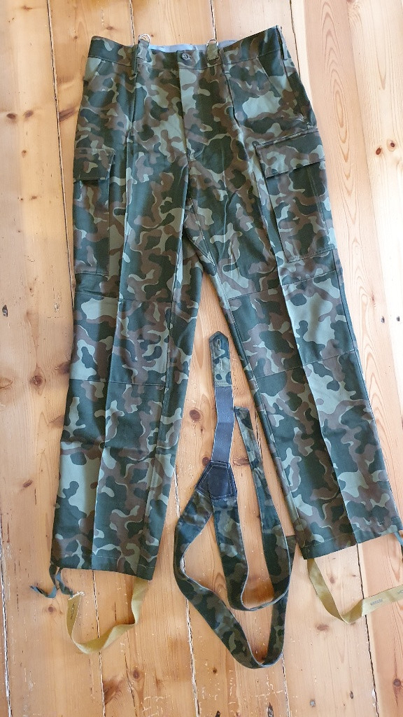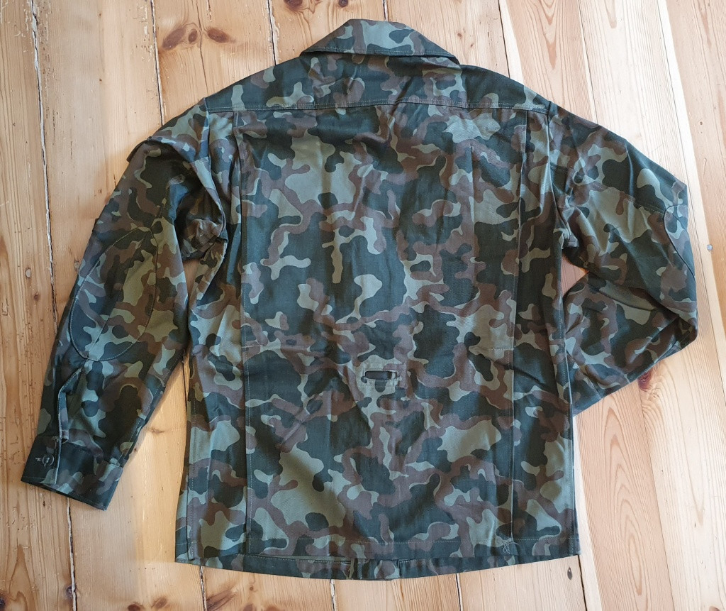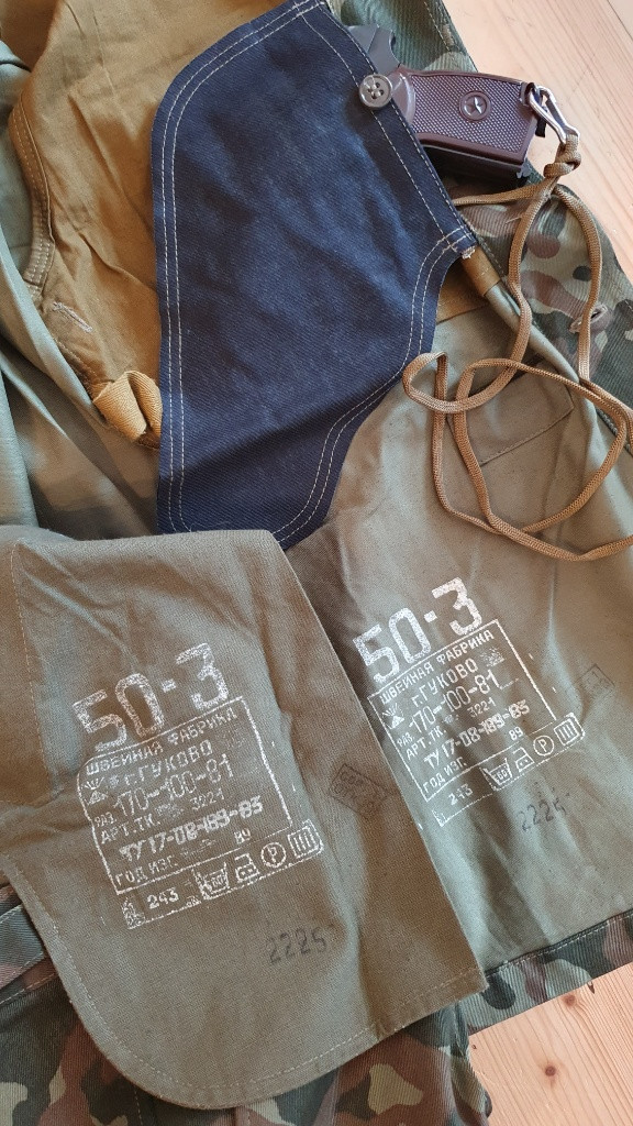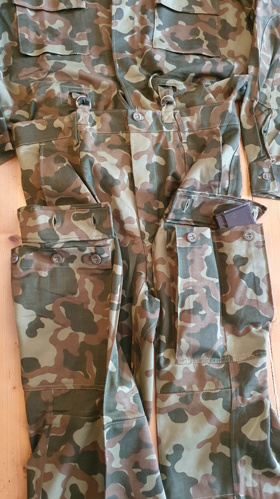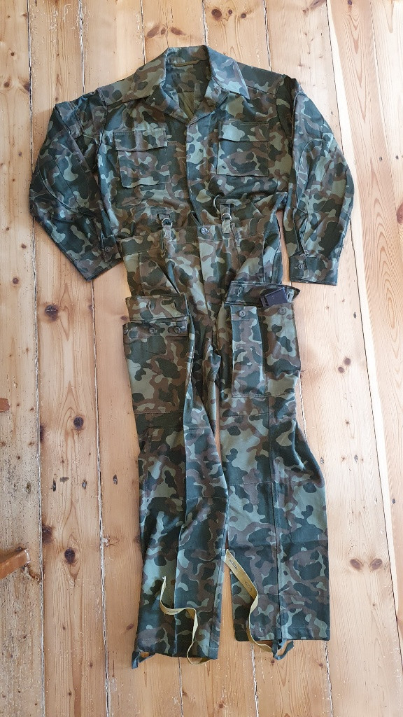 Prodám sovětskou uniformu pro vysadkáře ve vzoru TTsKO. Nikdy nenošené velikost 50/3, rok výroby 1989. Uniforma se odlišuje možnosti zakasat bluzu do kalhot a upevnit skrze otvory kšandami. Dále má blůza pouzdro na pistoli. Jedna kapsa na kalhotách je na 3 knoflíky, do druhé je možné dát 2 zásobníky pro AK.