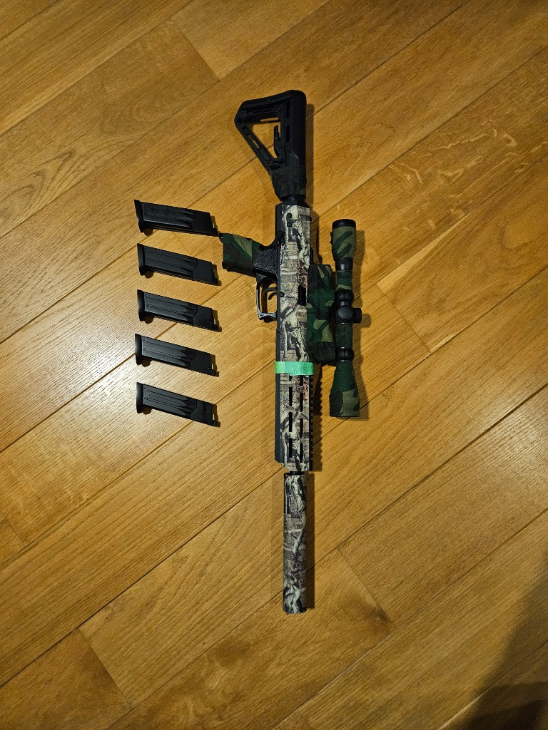 Zdravím mám na predaj SSX303 + 4 zásobníky + puškohlad nikko stirling mountmaster + Novritsch tlmič. Zbraň je v super stave bola použitá iba na 2och akciách. Predávam z dovôdu, že iba na ňu padá prach, kedže už nemám na airsoft čas. INFO: Plynová puška SSX303 Stealth GNB od Novritsch SSX303 Stealth Gas Rifle GNB od Novritsch je najtichšia plynová airsoftová puška, ktorá kombinuje vysokú presnosť, nízku hmotnosť a univerzálne použitie ako rýchla karabína pre CQB alebo presná DMR puška pre tichú elimináciu nepriateľa. Plynový pohon Green Gas poskytuje výkon v rozmedzí 90-130 m/s* s 0,20g guličkami, ktorý je možné regulovať výmennými vložkami trysky. Použitím silnejších plynov ako Red Gas je možné dosiahnuť výkon až 2,5 Joule (155 m/s). Jedná sa o plynovú zbraň bez blowbacku (GNB), čiže záver sa nehýbe. Vďaka tomu puška ponúka vyšší výkon a je mimoriadne tichá. Precízna 303mm vnútorná hlaveň od Maple Leaf zaisťuje vysokú presnosť a konzistentný výkon aj pri streľbe ťažšími BBs. Celé telo pušky je vyrobené z CNC obrábaného hliníka, čo dodáva zbrani nízku hmotnosť iba 1,65 kg a zároveň maximálnu odolnosť. Bez-nástrojová TDC hop-up komora umožňuje presné nastavenie hop-upu jednoducho prstom, takže je ideálna na korekciu presnosti priamo v boji. Puška je navyše kompatibilná so zásobníkmi SSX23 (upravená verzia pištole MK23), čo umožňuje použitie rovnakých zásobníkov pre vašu záložnú pištoľ aj túto pušku. Ak vám ani toto nestačí, tak zbraň je plne modulárna a obsahuje RIS lišty na predpažbí, štandardný ľavotočivý 14- mm CCW závit na montáž tlmiča a nastaviteľnú pažbu. Vďaka tomu je možné prispôsobiť zbraň podľa herného štýlu – od kompaktnej CQB verzie po plnohodnotnú odstrelovaciu pušku. Kľúčové vlastnosti Najtichšia airsoftová puška – minimálny hluk pri výstrele. Plynový pohon s výkonom 90-130 m/s* na Green Gas (až 2,5 J na silnejšie plyny). Precízna 303mm vnútorná hlaveň od Maple Leaf pre maximálnu presnosť. Ľahká konštrukcia z CNC hliníka s hmotnosťou iba 1,65 kg. Jednoduchá regulácia výkonu pomocou výmenných vložiek trysky. Bez-nástrojová TDC hop-up komora s plynulým nastavením. Kompatibilná so zásobníkmi SSX23 pre univerzálne použitie. RIS lišty na montáž príslušenstva (optika, svietidlo, grip). 14-mm CCW závit na montáž tlmiča. Nastaviteľná pažba pre variabilnú dĺžku pušky (640–720 mm). Technické špecifikácie Energia: 90 – 130 m/s* s 0,2g BBs (Green Gas) Kapacita zásobníka: 24 BBs Dĺžka: 640 – 720 mm Hmotnosť: 1,65 kg Dĺžka vnútornej hlavne: 303 mm Materiál: CNC hliník Hop-up: Nastaviteľný, TDC Režim streľby: Jednotlivo Závit na tlmič: 14-mm CCW (ľavotočivý) Kompatibilita so zásobníkmi: Novritsch SSX23