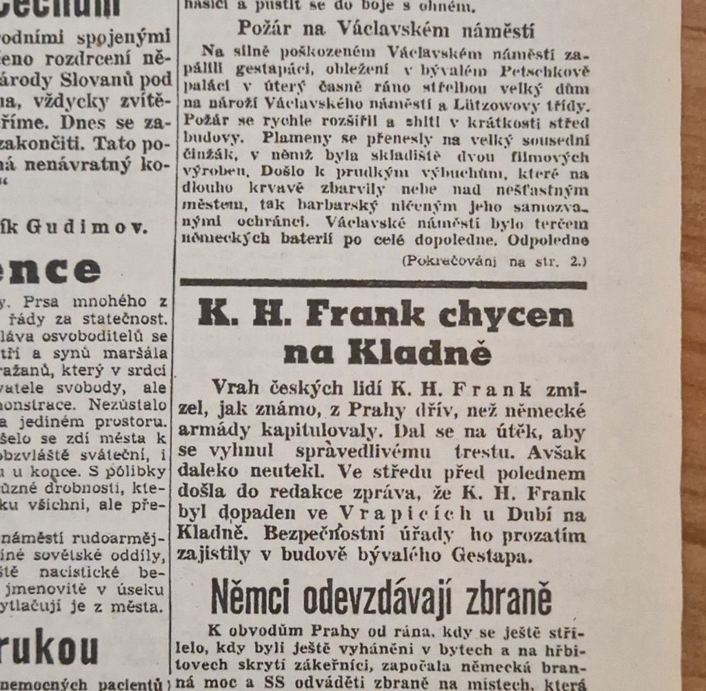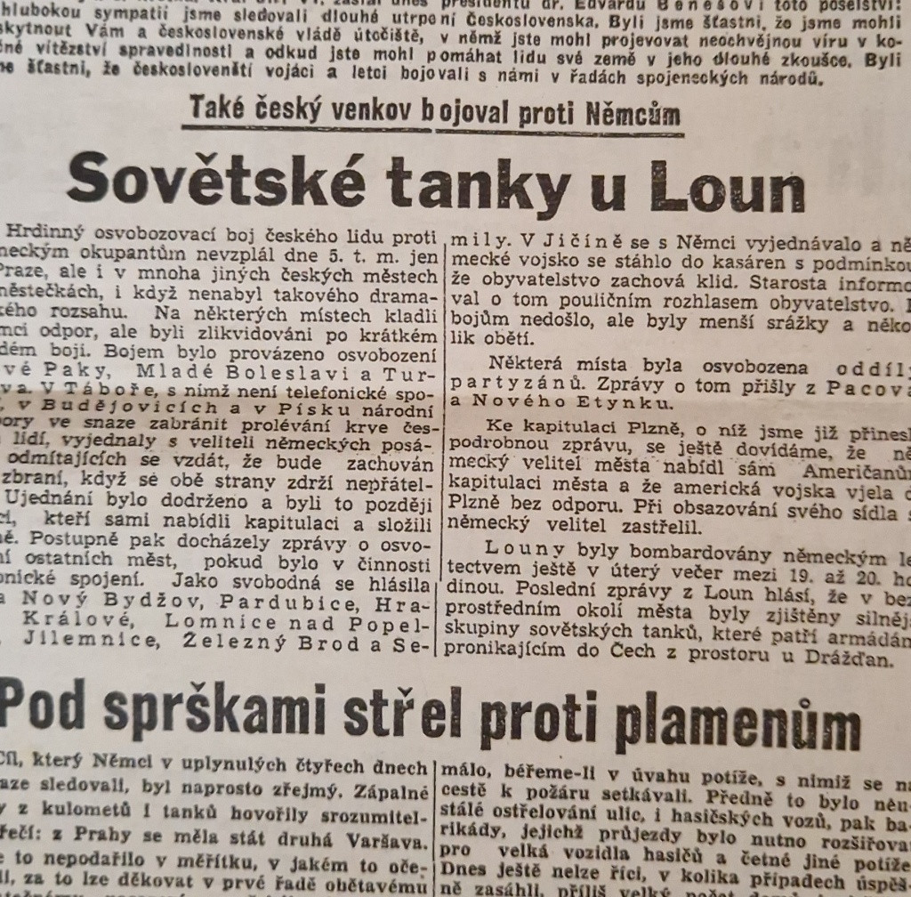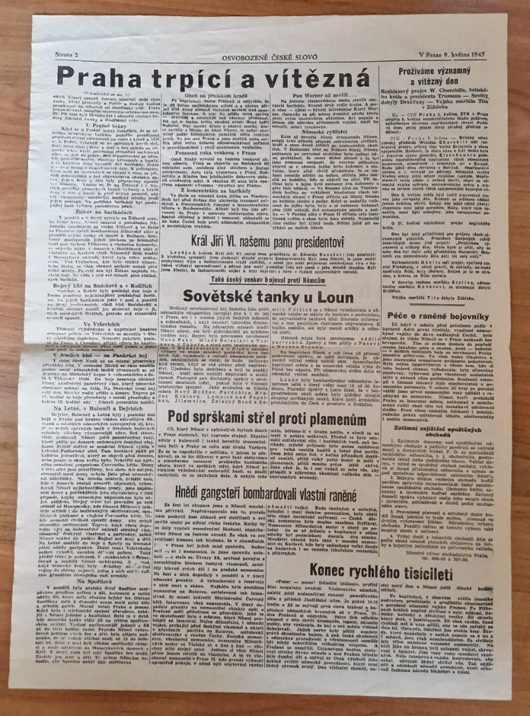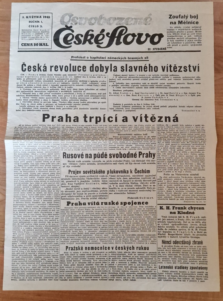 Popis:Staré origo noviny České slovo, 9.květen 1945