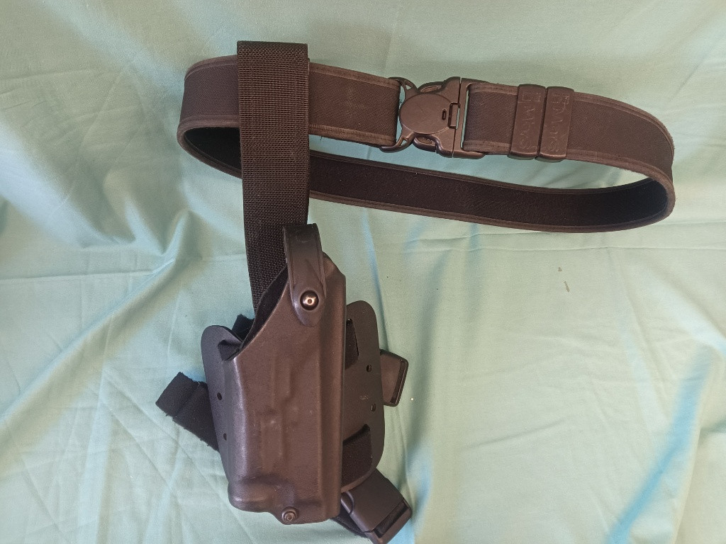 Prodávám používané kydexové pouzdro safariland na pistol Glock 17 nebo 34 se svitilnou streamlight TLR1. Umístěné na stehenní platformě safariland. Která je vylepšená o semišovy potah . Pouzdro je tvarované na pistol Glock se svítilnou a používal jsem ho pro pistole Glock 17 se svítilnou streamlight TLR1. Prodávám to co je na fotkách. Jako prémii přidám k pouzdru taktický opasek Mars. Posílám jen přes zásilkovnu. Zásilkovné platím já. Prodávám za : 4000kč
