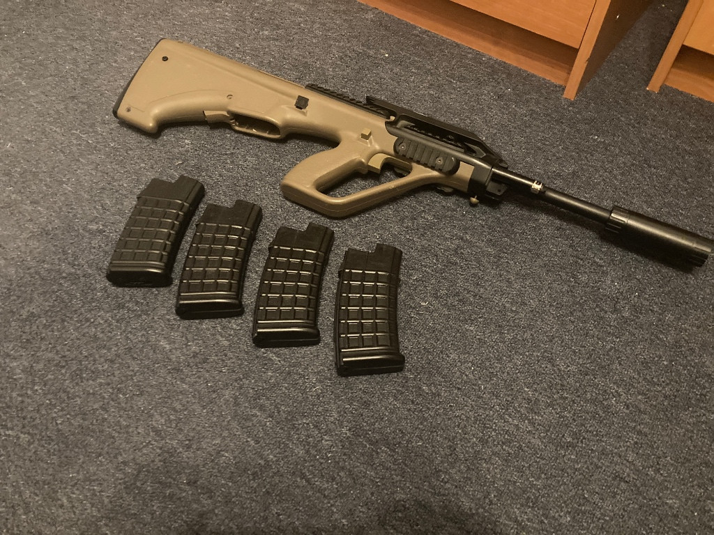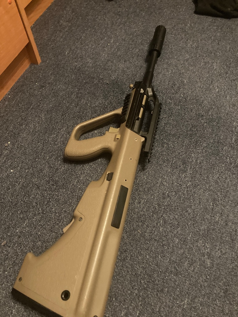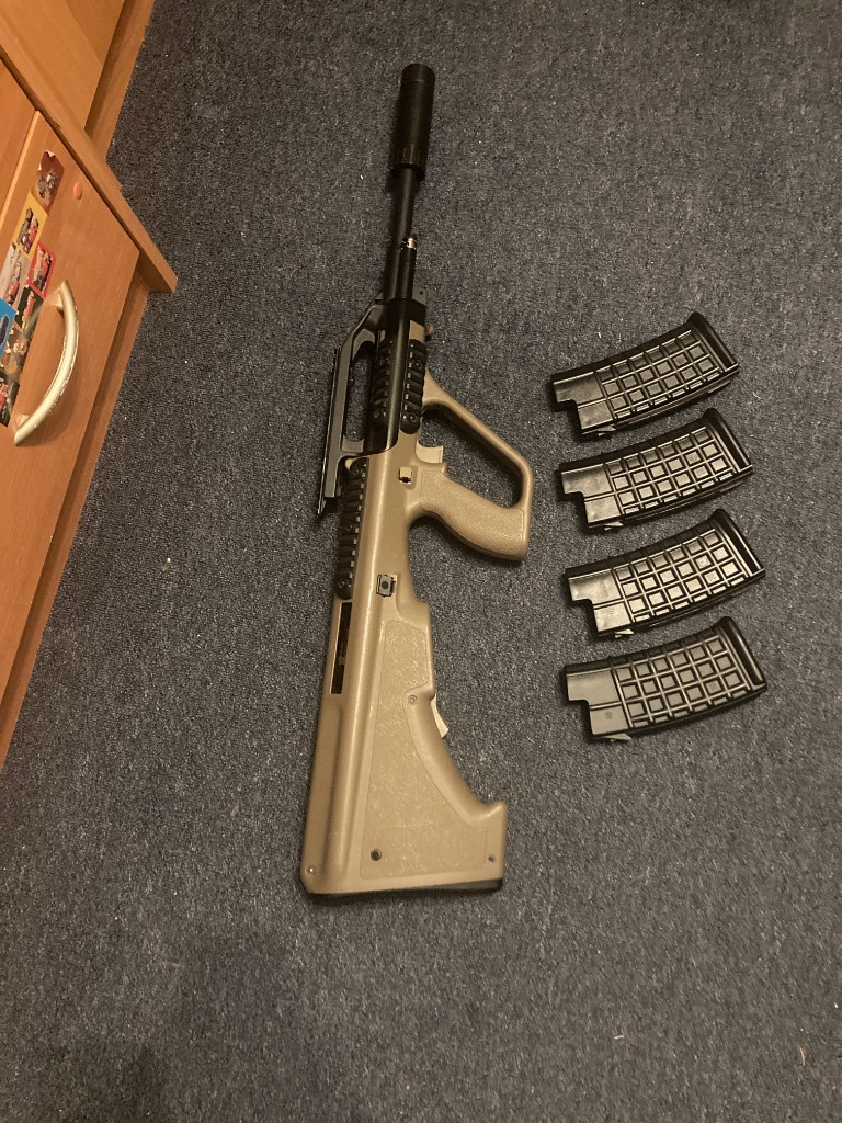 Prodám airsoft AUG od značky army arnament párkrát použitý na airsoftových akcích. Má nějaké kosmetické vady ale žádná nemá vliv na funkčnost zbraně. Dám k němu čtyři zásobníky tři tlačné a jeden točný.