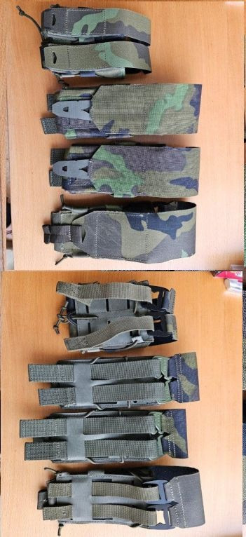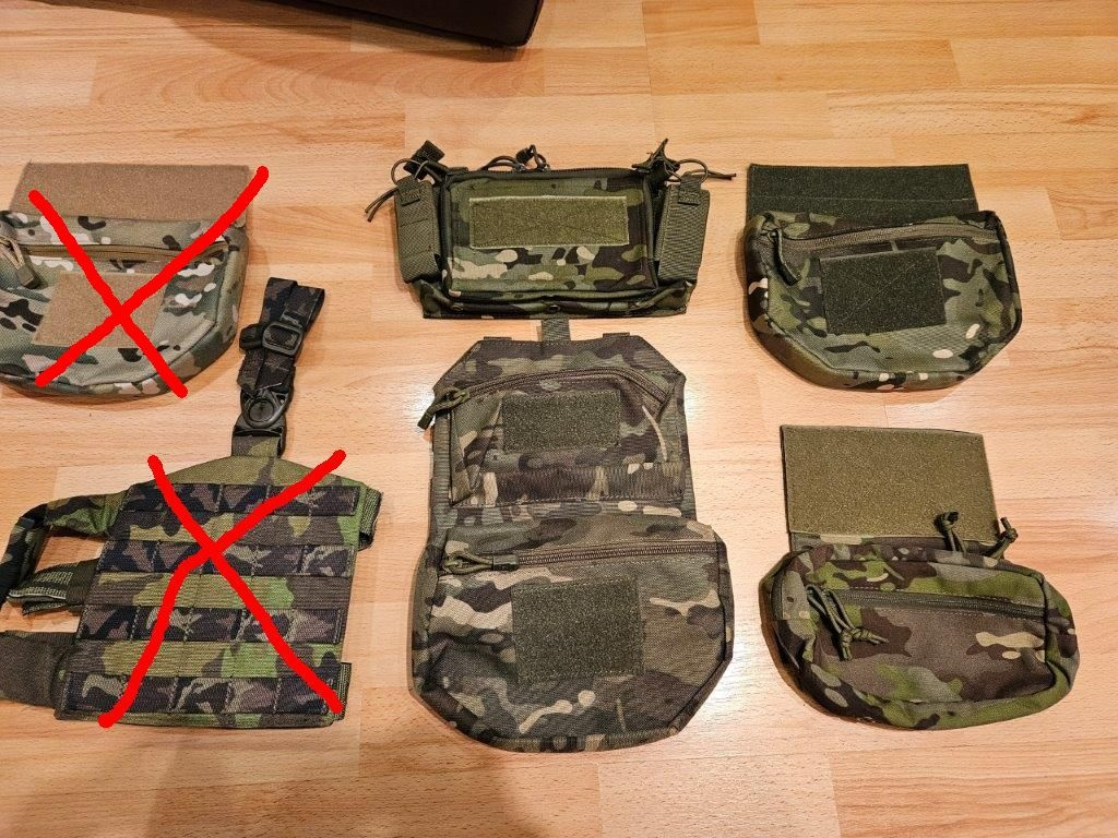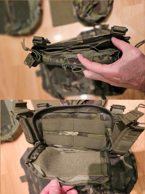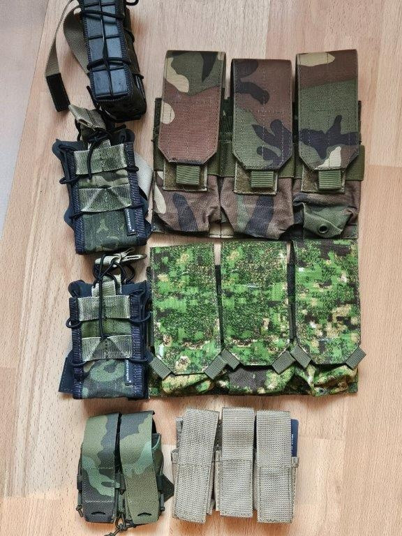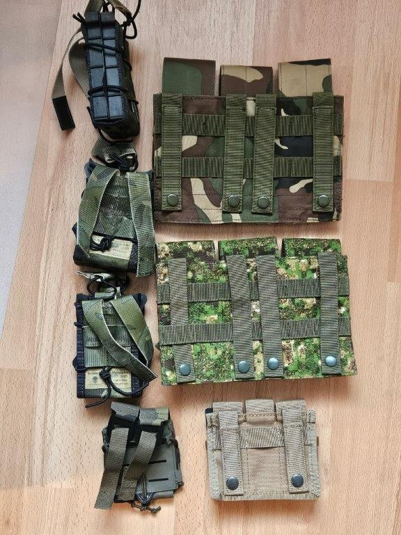 materiál Cordura: - přední podvěšené kapsy 180/ks - přední kapsa/flap na 3 zásobníky M4, 2x pistolové, přední úložná kapsa na zip (330) - zádový batoh na vestu/nosič, s prostorem na hydratační vak (290) - trojsumky 200/ks - použité - dvojsumky Emerson 100/ks - použité - Sumky Argun 300 (nové)