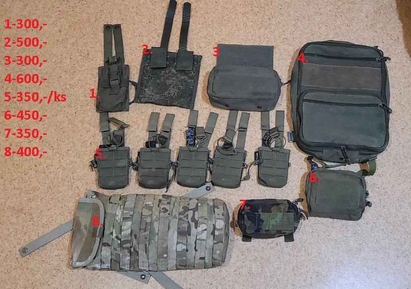 Sumky jsou používané ale bez žádných závad, ceny na foto 1-sumka vysílačka (???) 2-sumka na polní lopatku (technikom) 3-břišní sumka (emerson gear) 4-batoh molle na vestu (???) 5-HELIKON sumka COMPETITION na zásobník AR15 / AK 6-HELIKON univerzální sumka COMPETITION 7-PRODÁNO 8-camelbag mc (???)