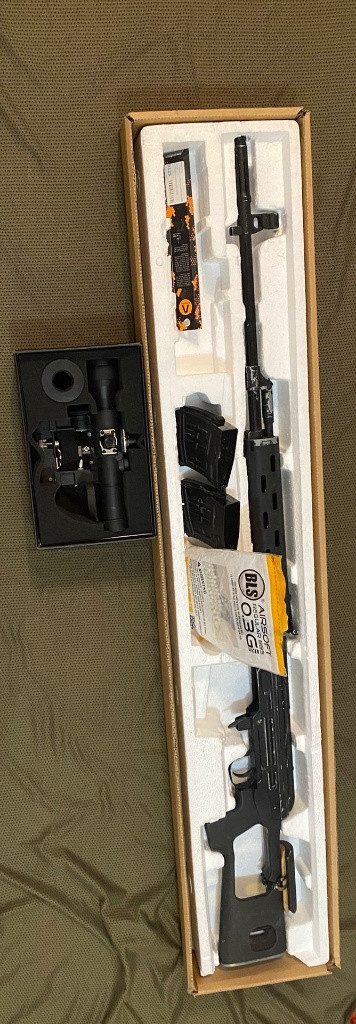 Prodávám svoji airsoftovou manuální odstřelovačku SVD Dragunov od firmy A.C.M. společně s optikou PSO-1 od stejné firmy. Zbraň je téměř nehraná, byla použitá pouze na pár akcí a to převážně jen na fotky. Proto stav funkčně 10/10. Ovšem vzhledově je na místech odřená, převážně v oblasti montáže puškohledu (viz foto). Tyto odřeniny nijak nevadí ve funkčnosti zbraně a jsou pouze "estetické". Puškohled je rovněž téměř jako nový, ale bohužel došlo ke ztrátě jedné z krytek seřizování puškohledu. Rovněž jako u pušky to ale nemá žádný efekt na jeho funkčnost. Důvod prodeje - nevyužití Ke zbrani přidávám rovněž dva zásobníky, pružinu M150 a zbytek kuliček 0,30g od firmy BLS Cena samotné zbraně - nová = 3 500, nyní - 2 500 Kč Cena samotného puškohledu - nový = 3 290, nyní - 2 200 Kč Při koupě pušky i optiky dohromady cena 4 000 Kč Pokud máte zájem, prosím pište mi buďto na WhatsApp, SMS nebo email