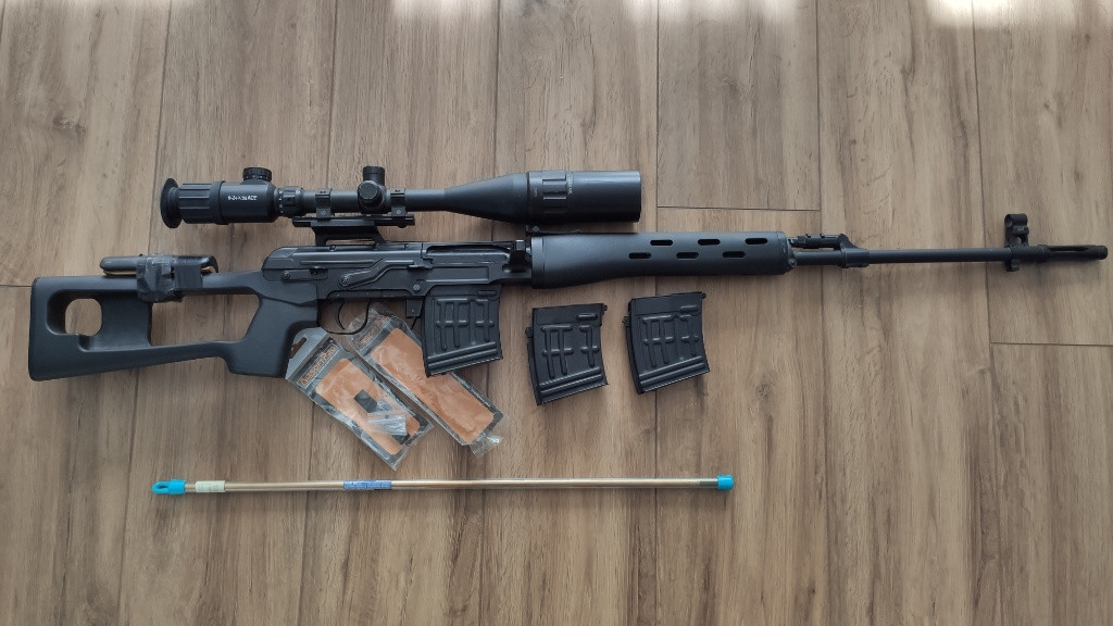 Prodám nevyužitou zbraň ze svého arzenálu. Jedná se o SVD s celou vzduchotechnikou z Airsoftpro, + hop-up Airsoftpro upg a hlaveň madbull 6,01 Pružiny jsou M150 a M170 + Kuličky Madbull Montáž na puškohled a Puškohled 6-24x50 AOEG Ke zbrani přidám 2 další zásobníky a pro zájemce mám i mole pouzdro na zásobníky vz95 SPM (Už nejde sehnat). Zbraň má už své roky ale pro začínajícího snipera to bude skvělá volba. pořizovací cena byla kolem 9 tisíc. Zbraň leží doma a je třeba, aby dělala radost někomu jinému.