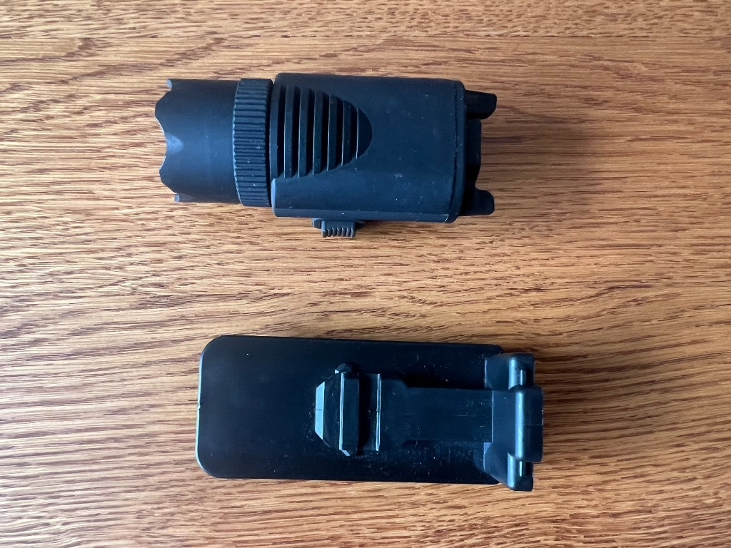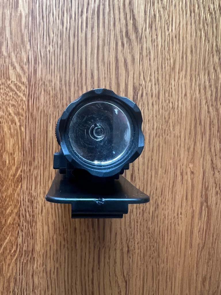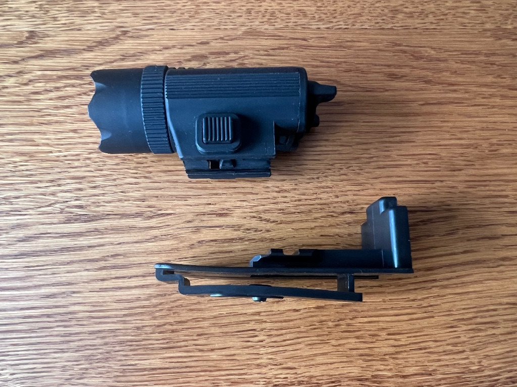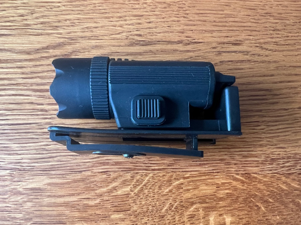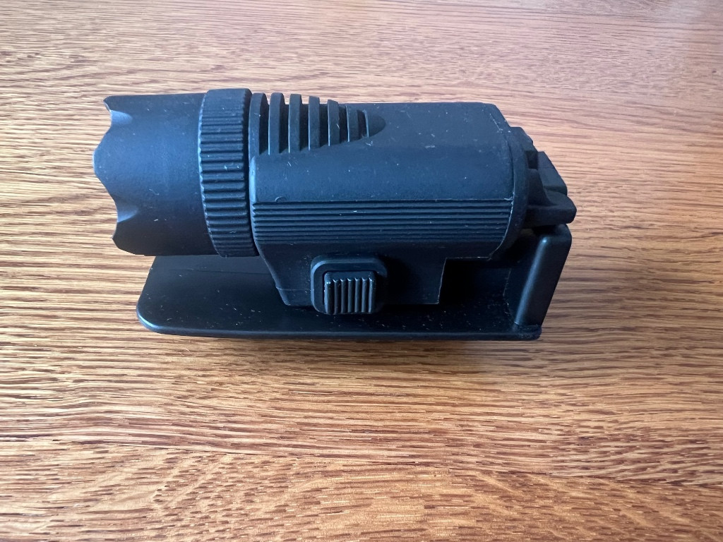 Pistolová svítilna ASG Super Xenon na RIS lištu, 100 lumenů. Snadné ovládání vzadu umístěným spínačem. Součástí je klip na opasek. Napájení 2× baterie CR123A Nezničená, používaná.