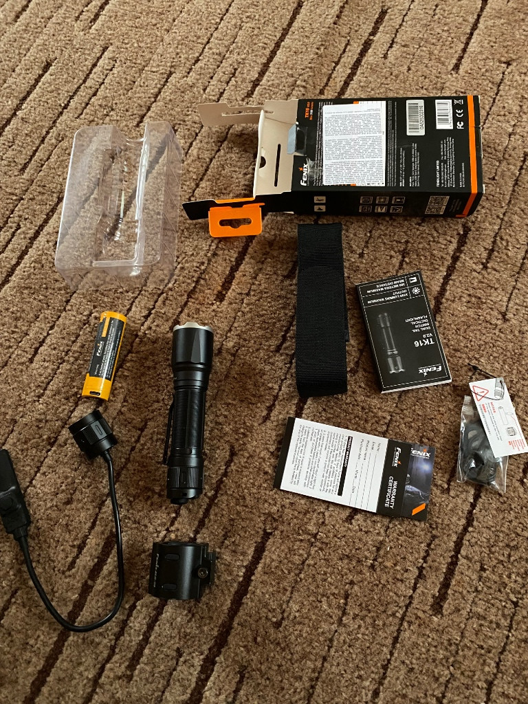 39) Svitlna fenix 3000lumenu (kralovna svitilen) aji s dobijeci baterii fenix 5000mah a s tlakovym spinacem origo baleni, plne funkci, nova stala 2700kc, potom dokoupena montaz na ris za 500kc a dokoupeny tlakovy spinac za 500, komplet vsechno prodam za 2700kc. lze odebrat i po castech