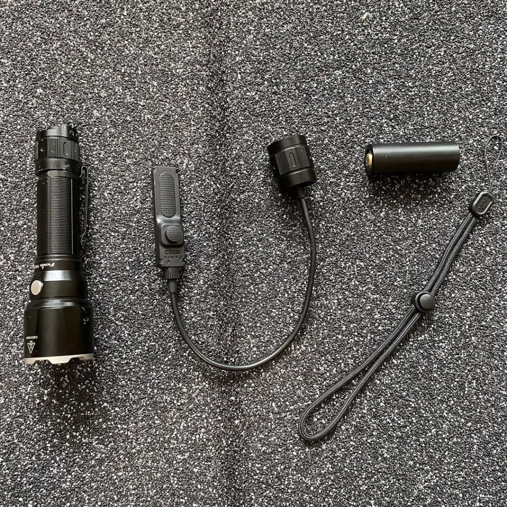 Svítilna Fenix TK22 UE s taktickým vzdáleným spínačem AER- 04, Adaptér na CR baterie a poutko. Vše v černé barvě. Vše je 100% funkční, svítilna má na sobě drobné oděrky / škrábance (viz foto) skrz používání - nemá vliv na funkčnost!