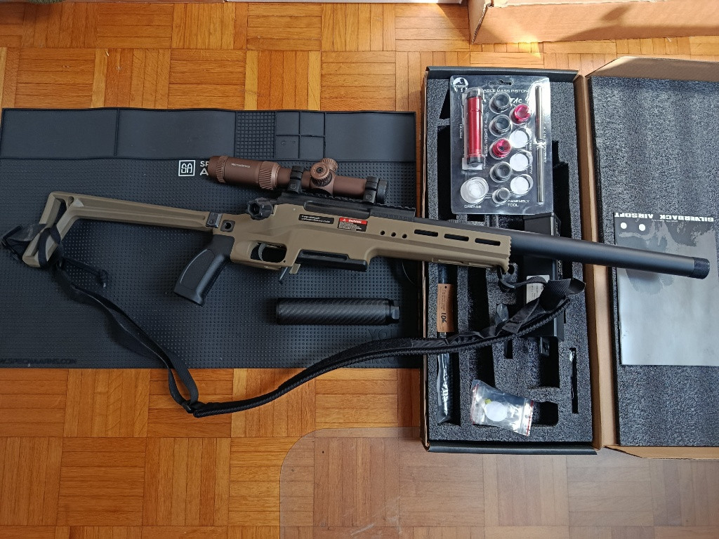 Prodám rok starý Tac 41 Light Sport. Puška davá stabilní 2.3J na 0.48g a základní pružině (dá se natáhnout malíčkem) odvážený píst a Hop guma STALKER, upgrade dělal HorseMan Airsoft (ActionShop prodejna v Brně) K pušce puškohled Hunter + 3D tištěným Killflash, Carbon tlumič a 110 ranný zásobník navíc.