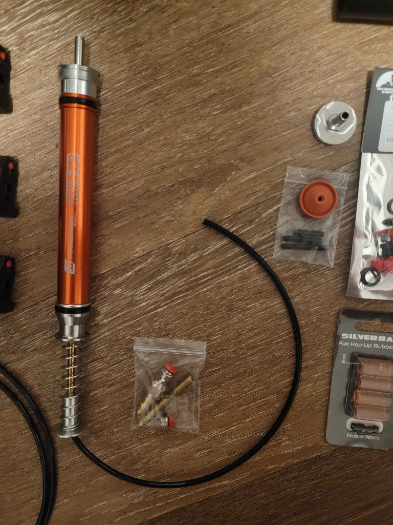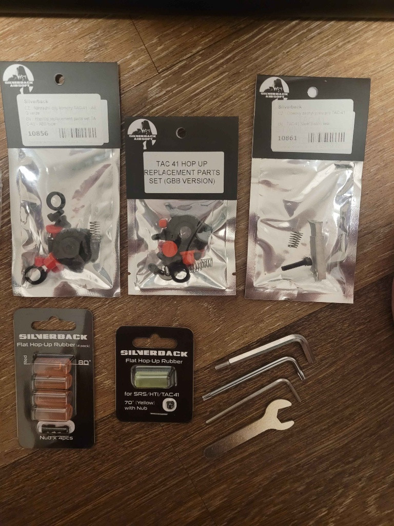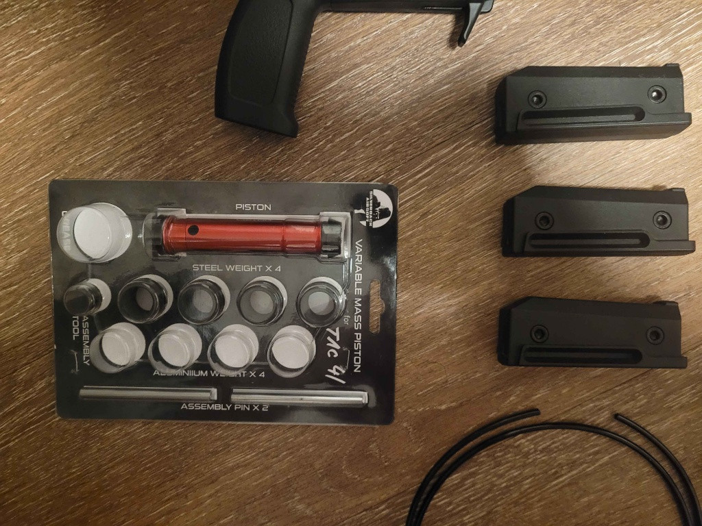 Zdravím, nabízím k prodeji Tac-41 od značky Silverback. Zbraň je nyní naladěná na 3,3J při .48 kulích na ASPRO M150 pružině. Ve válci najdeme zatížený píst s Advance hlavou od Silverbacku pro použití s GBB komponenty Silverback (hlava válce a CNC hop komora), díky kterým můžeme použít GBB vnitřní hlaveň a hop gumičku místo standartní AEG. Ve vnější "twisted" hlavni najdeme GBB Maple leaf crazy jet hlaveň o délce 430 mm a GBB gumičku od Silverbacku. Vnitřní hlaveň nepřesahuje do tlumiče, ten je vyplněný vložkami od Epesu. Zbraň je osazená optikou 4-16x44 od Storm airsoft(na optice pouze namotaná maskovací síť). Dále k Tacu přidám 3 zásobníky, HPA SDIK kit od Mancraftu, původní vnější hlaveň osazenou CNC komorou a hlavní AEG, náhradní díly pro GBB i AEG komory, náhradní díly pro spoušťák, díly pro vzduchotechniku viz. obrázky, AEG hop gumičky od Silverbacku a nářadí pro demontáž zbraně. V případě zájmu se ozvěte a domluvili bychom se na ceně.