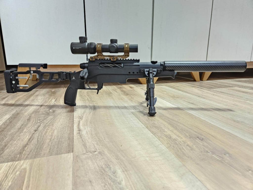 Upravená verze Tac 41 sport. Custom dělaná a tištěná pažba a upravené těle pro její uchycení. Dále zkrácená vnější hlaveň (originální délka součástí), upravené tělo a namontován tlumič jako část hlavně a zbytek pro tlumení. Použita základní hlaveň, 120nm silverback pružina, 70 degree SB gumka, přítlak hadron a štělovací kolečko Medusa. Twisted SB válec, uvnitř VMP píst a MF hlava.Pro krátkou délku nalazeno na 2,4J s 0,45 ( Silnější pružina, delší/ užší hlaveň v pohodě zvedne výkon výše). Je to spíše krátká "záložní" snipa pro někoho s SMG, i když záleží na hráči jak ji využije. Bez optiky a nožek. Součástí je zbraň, krátky a dlouhý zásobník, custom a originální pažba. Nožky lze nechat za 800+ Kč.