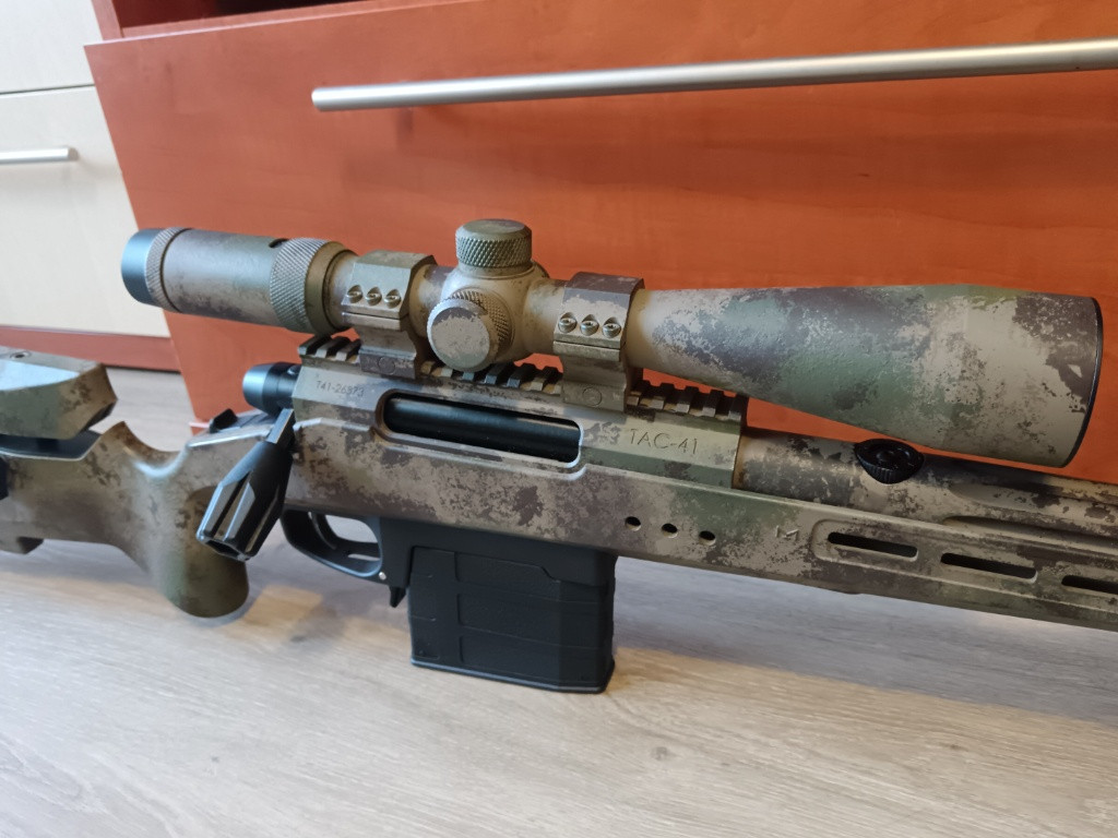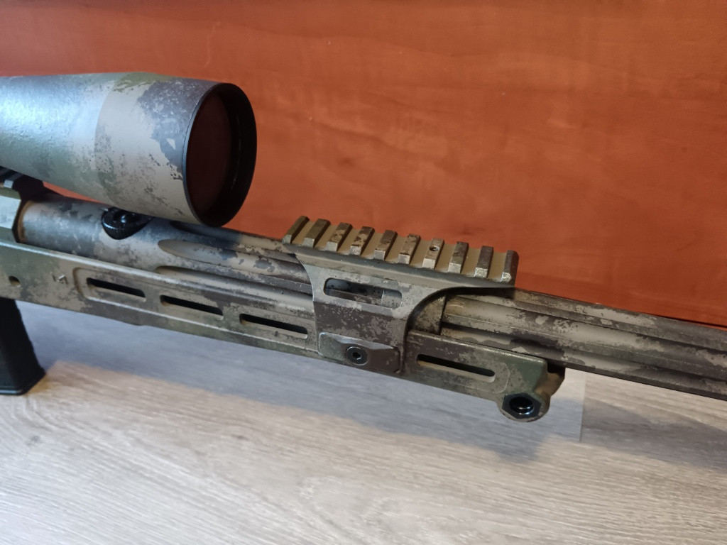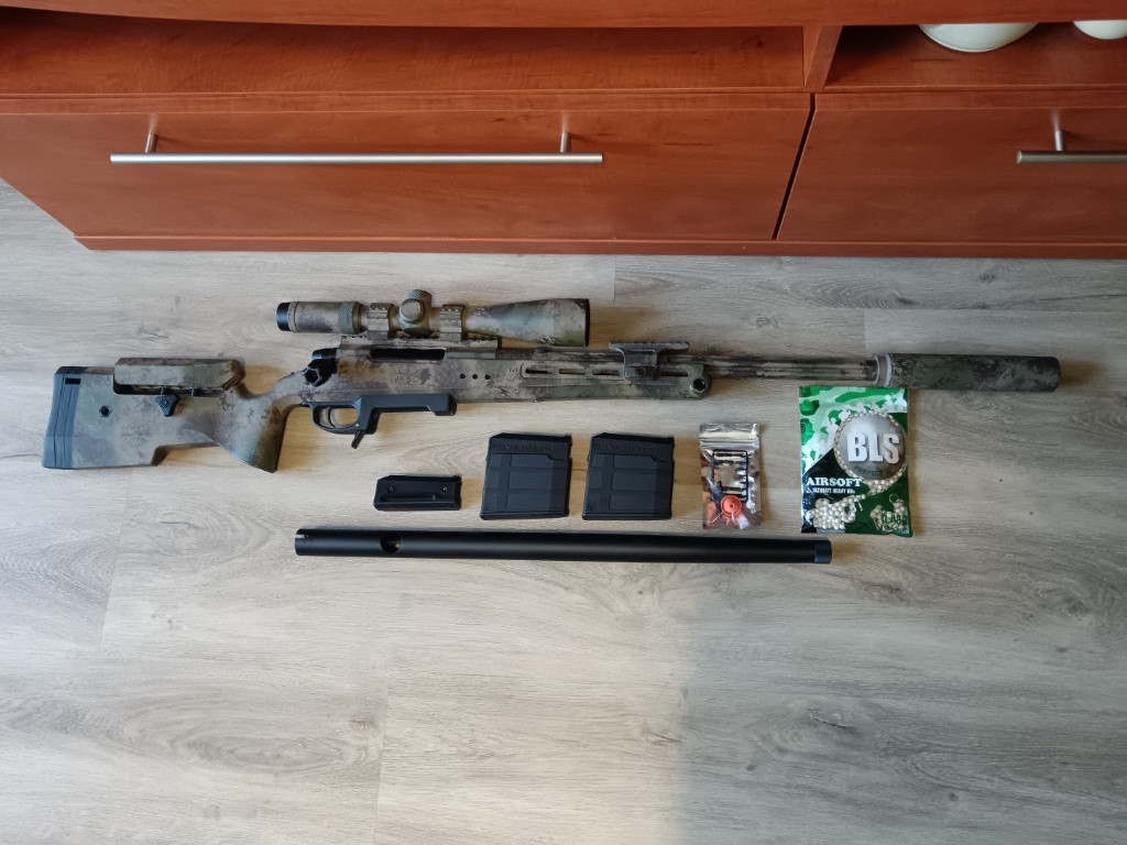 Prodám Tac-41P od SilverBacku. Ve zbrani je modulární pružina Rapax 3j+, SB žlutá 70° guma. Píst je zatížený. Na zbrani je kratší vnější drážkovaná hlaveň 420mm, vnitřní hlaveň je protažená do tlumiče, tlumič SB kovový 200mm. Dále je na zbrani přední RIS montáž, pod ní je udělaná kovová vložka na vymezení vůlí vnější hlavně vůči pažbě. Optika Vector Optics Forester. Přidám náhradní hlavu pístu s brzdou, dva dlouhé zásobníky a kuličky BLS 0,48g. Výkon 3,35j na 0,48g. Cena dohodou