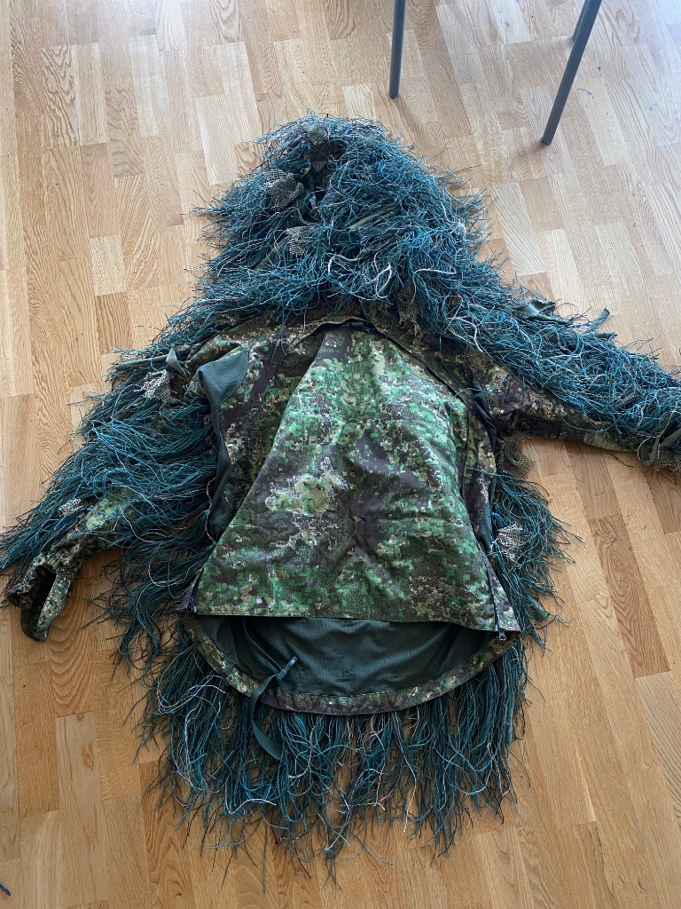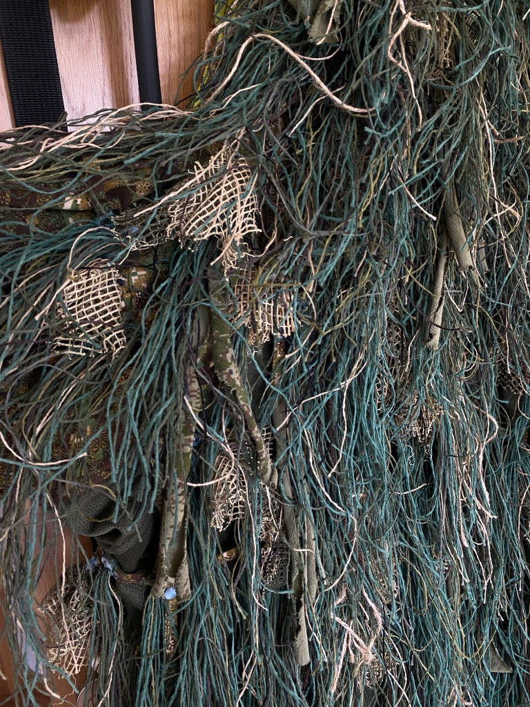 Ručně vyrobená „kikimora“. Základem je Diverzant poslední generace od firmy Tactical Evo. Tato základna byla nošena na Lizardu minulého roku a ještě na jedné nedělní akci. Poté byla upravena – přidáno vše, co vidíte. Všechny uzly jsou svázané a zalepené. 3D prvky jsou upevněny pomocí malých stahovacích pásků. Má za sebou pár her v rámci přirozeného opotřebení maskování (prakticky jsem se záměrně plazil, aby se nasbíraly větvičky a listí). K sadě přidám krabici s nitěmi, kdybyste chtěli něco dodělat. Také přikládám fotografie z procesu pletení. Vel L Cena: 4000 Kč