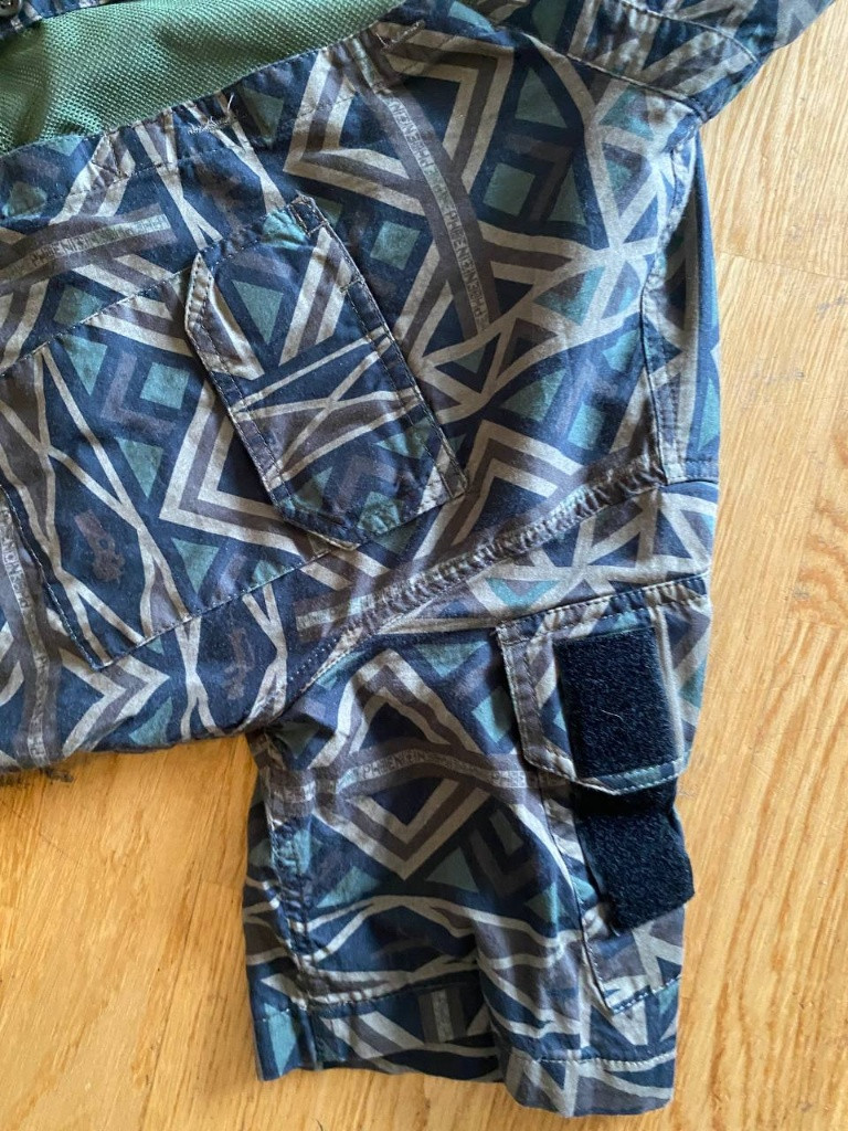 Bojová, taktická, stylová, praktická a naprosto parádní košile. Boční elastické vložky pro pohodlné nošení opasku s vybavením nebo pouzdrem. Na jednom z dolních lemů je všitá mikrovláknová vložka na čištění brýlí. Hrudní a ramenní kapsy, ramenní s velcro panely na nášivky. Stylový vzor typu „těžko říct co“, ale jsou tam zbraně – a vypadá to fakt skvěle. Na zádech speciální kapsa pro odvětrání, aby se vám nepotila záda. Kdyby mi nebyla malá, nikdy bych ji neprodal. Cena: 1500 Kč.