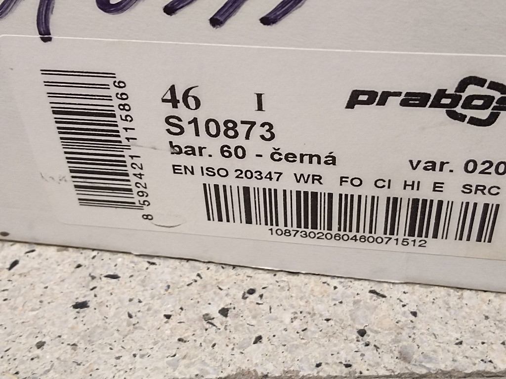 Model: Prabos S10873, varianta 020 (černá barva). Velikost: 46. Normy: Certifikováno dle EN ISO 20347 (pracovní obuv). Vlastnosti: Odolnost proti vodě (WR), palivovému oleji (FO), chladu (CI), teplu (HI), absorpce energie v patě (E) a protiskluzová podešev (SRC). Nové nenošené