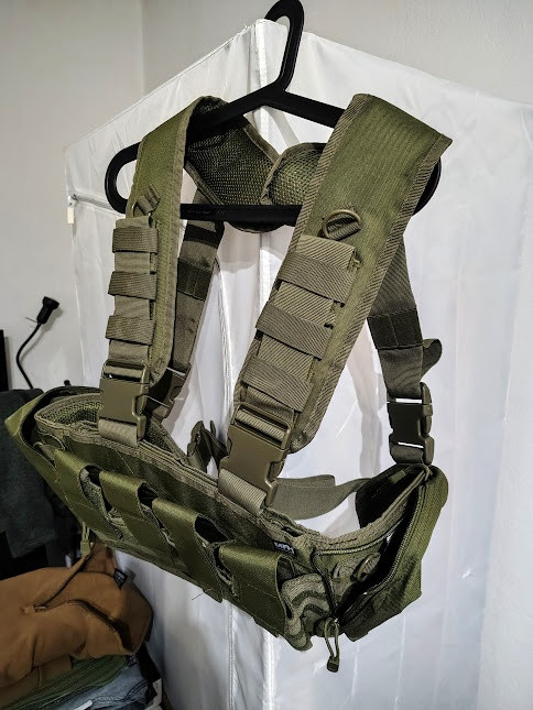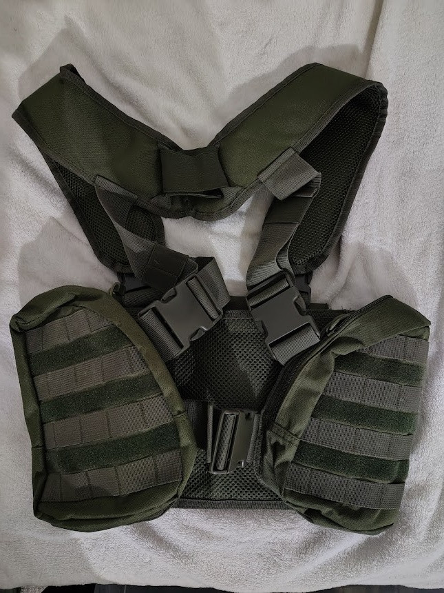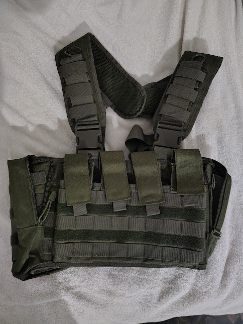 Prodám taktickou vestu (chest rig) od MFH v olivové barvě. Kopie Tasmanian Tiger. Vejde se do ní 8 zásobníků M4. Sklopný přední panel. 3 boční kapsy (vejde se tam třeba čutora, pistole atp.). Na akcích asi dvakrát, skoro jako nová.
