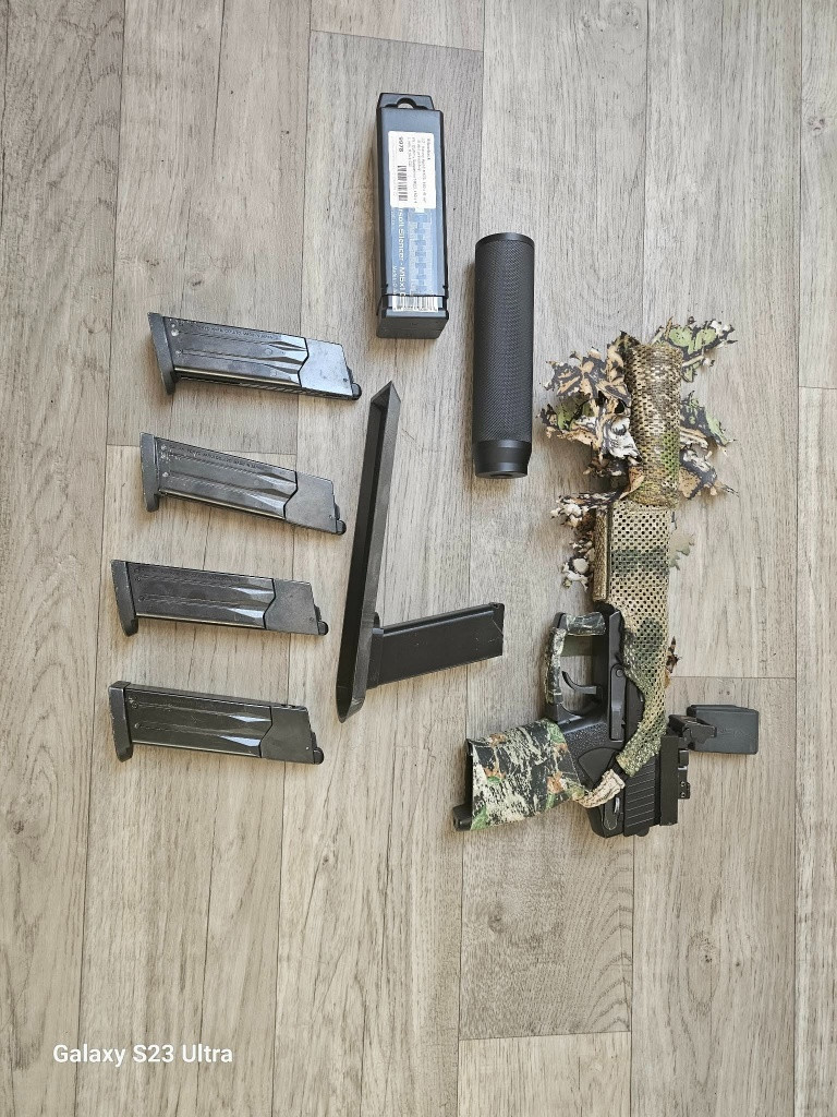 Uvnitř - maple leaf crazy jet hlaven, maple leaf gumička, tdc od hadronu - pritlak, plate a tdc modul K pistole dám silverback tlumič, krátký custom tlumič , kolimátor , 4x zásobníky a novritsch šprcku